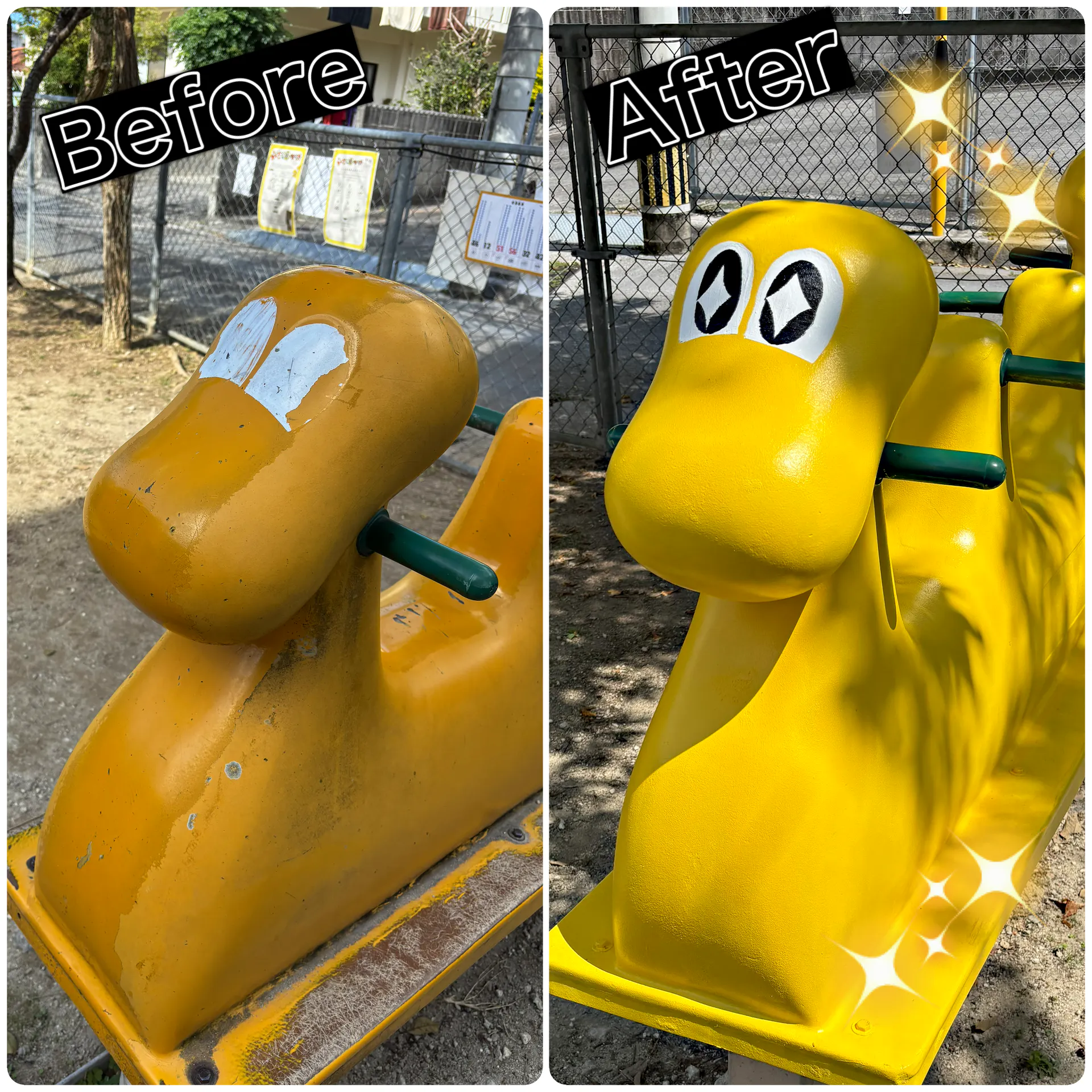 2025/03/28 11:43みなさまのおかげで、無事にらくだくんの塗り替え作業を完了いたしました。ボディ乾燥の後日、近所の小学生達が投票で決定した目のデザインに目入れしてくれました。ボディは明るいレモン色で塗り替え前よりも若々しい印象に!道路側はねむいらくだくん、鉄棒側はキラキラらくだくんに生まれ変わりました!より一層子ども達にかわいがってもらえることと思います。暖かいお言葉とともにご支援いただいたみなさまに感謝いたします。ありがとうございました。らくだスタッフより もっと見る