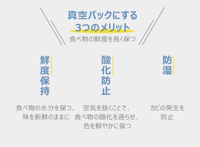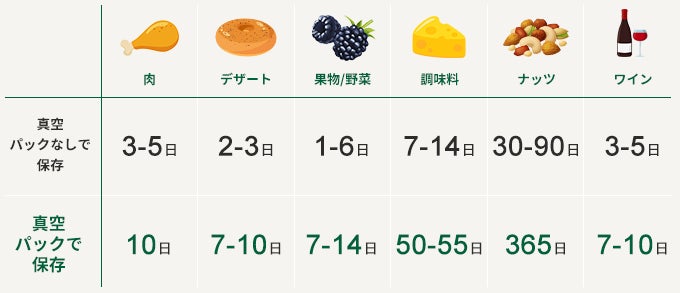 真空パックによって食品が空気に触れにくくなるため、酸化や腐敗を大幅に抑制し、鮮度を長時間キープします。例えば、野菜は10日以上、肉や魚は1週間以上も新鮮な状態を保つことができます。ワインの場合も、真空状態で保存することで、開栓後も風味を長く楽しめます。