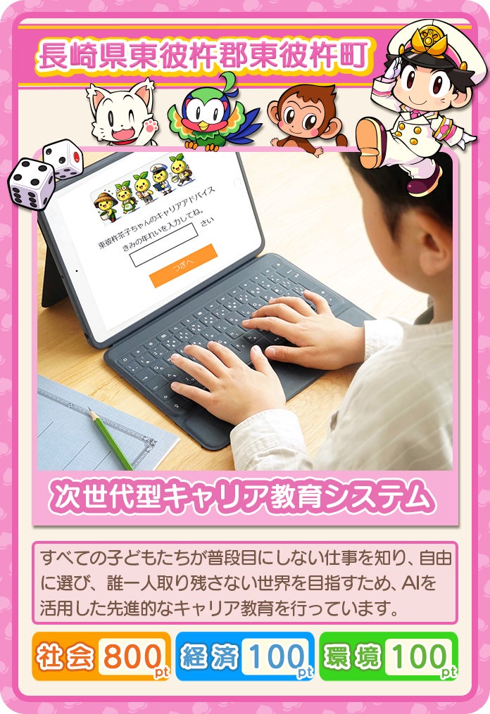 これが東彼杵町のAIキャリア教育システム体験版!ついに完成した体験版で是非お楽しみください。添付写真は、会場来場者に配布される物件カードです。東彼杵町以外の物件カードがありますので、たくさん回遊して日本全国の知られざる地方をご体験ください。
