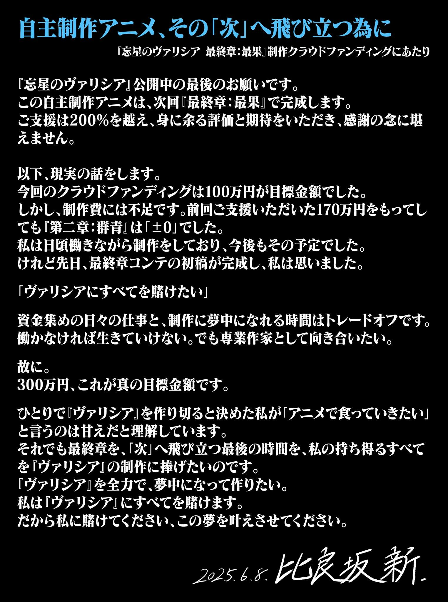 アニメーターになれず、それでもアニメから離れられず始めた自主制作アニメ。モノづくりには資金も時間も肉体の維持にもお金がかかることは理解しています。それでもやると決めた全三部作の『忘星のヴァリシア』。どうしてもこの作品を最後まで描きたい。私にはこれしかないから。