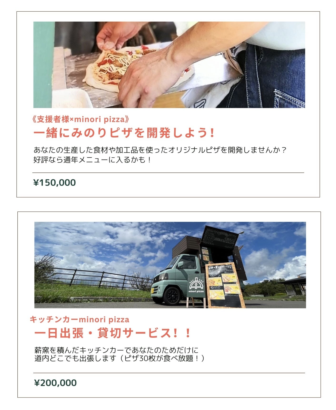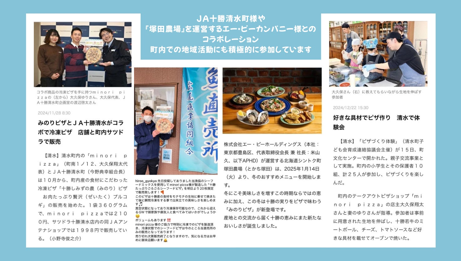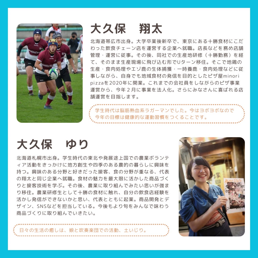 2020年にキッチンカーminori pizza(みのりピザ)を立ち上げ、2023年には十勝清水町にコンテナハウスのテイクアウト店舗をオープンしました。ピザという商品を通じて十勝産食材の素晴らしさや、作り手の想いをお客様にお届けしています。