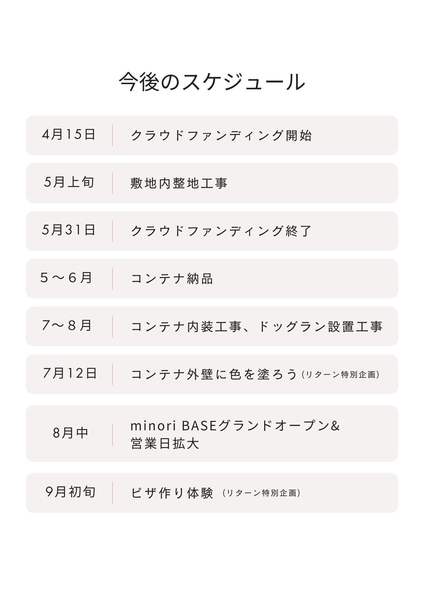 2026/01/20 09:29皆様、あけましておめでとうございます!2026年が始まって、早半月ほどですが、いかがお過ごしでしょうか?minori pizzaには年末年始の忙しさを超え、少し落ち着いた日々が戻ってきています。さて本日は、2025年4月〜5月にかけて行ったクラウドファンディング「コンテナ広場プロジェクト」のご報告動画です!たくさんのご支援と応援メッセージ、本当にありがとうございました。皆様のおかげ様で、無事ほとんどDIYの工事が終わり、10月にリニューアルオープンを迎えることができました。少しずつ認知も広がり、週末を中心にキッズスペースつきイートインが賑わっております!まだまだ設備面、サービス面、未熟な部分が多くありますが、日々改善してより快適に過ごせる空間づくりに取り組んでまいります。と同時に、ピザのクオリティの向上、ワクワクする新メニューの開発などなど頑張っていきますので、引き続きあたたかく見守っていただけたら嬉しいです。それでは動画をぜひご覧ください!https://youtu.be/dL-cJhZyCiE もっと見る平日の営業日を拡大しました!!