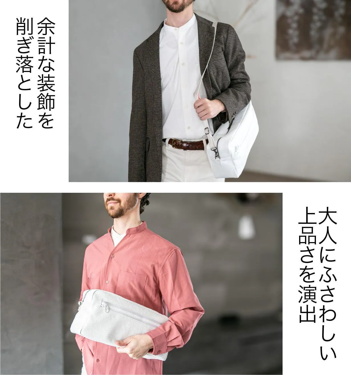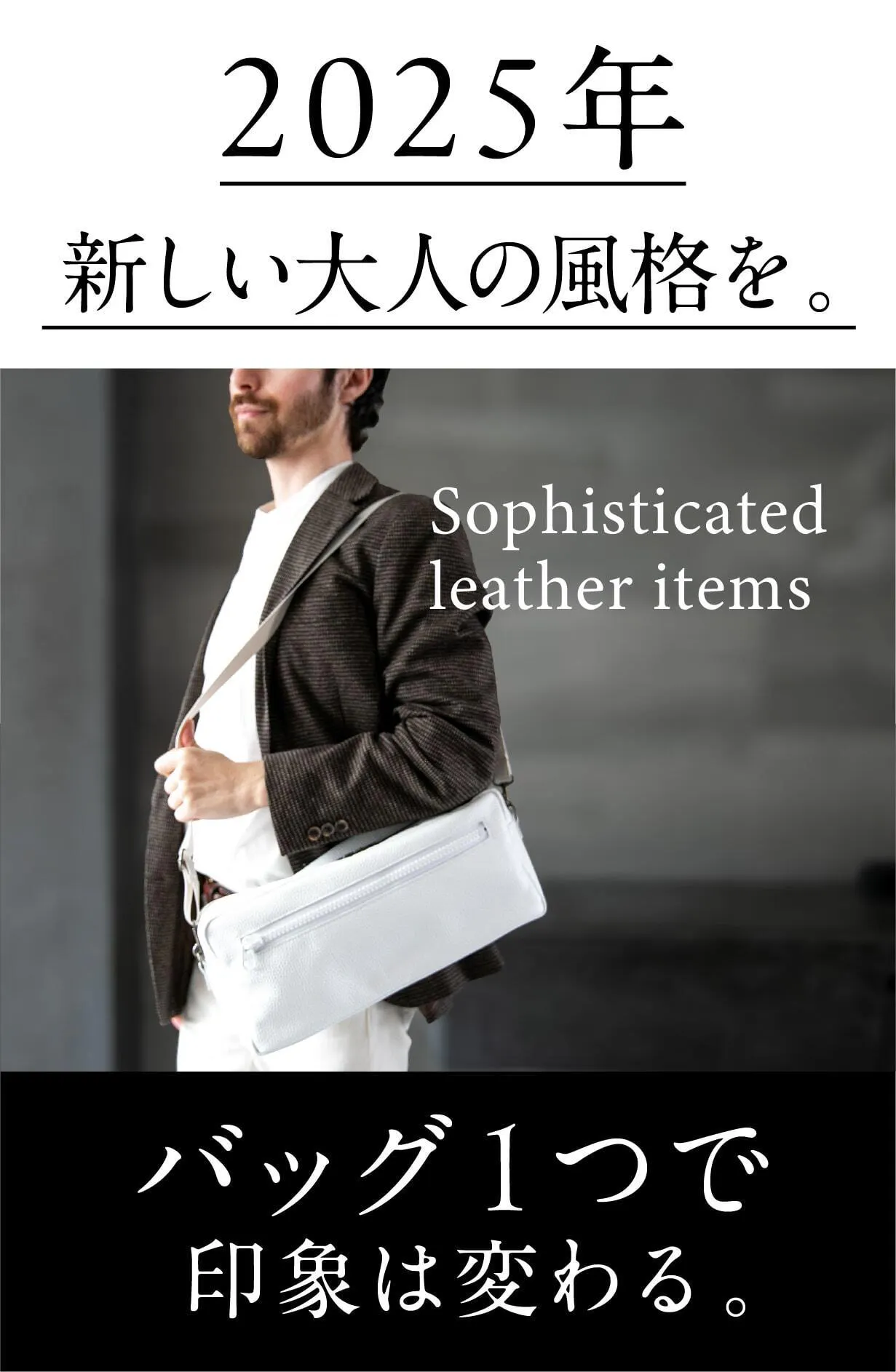 洗練されたレザーアイテムを取り入れてみませんか?ホワイトレザーの革新とブラックレザーの信頼感が、大人の魅力を一層引き立てます。上質なアイテムで日常を格上げし、自分のスタイルに自信をプラスしましょう。