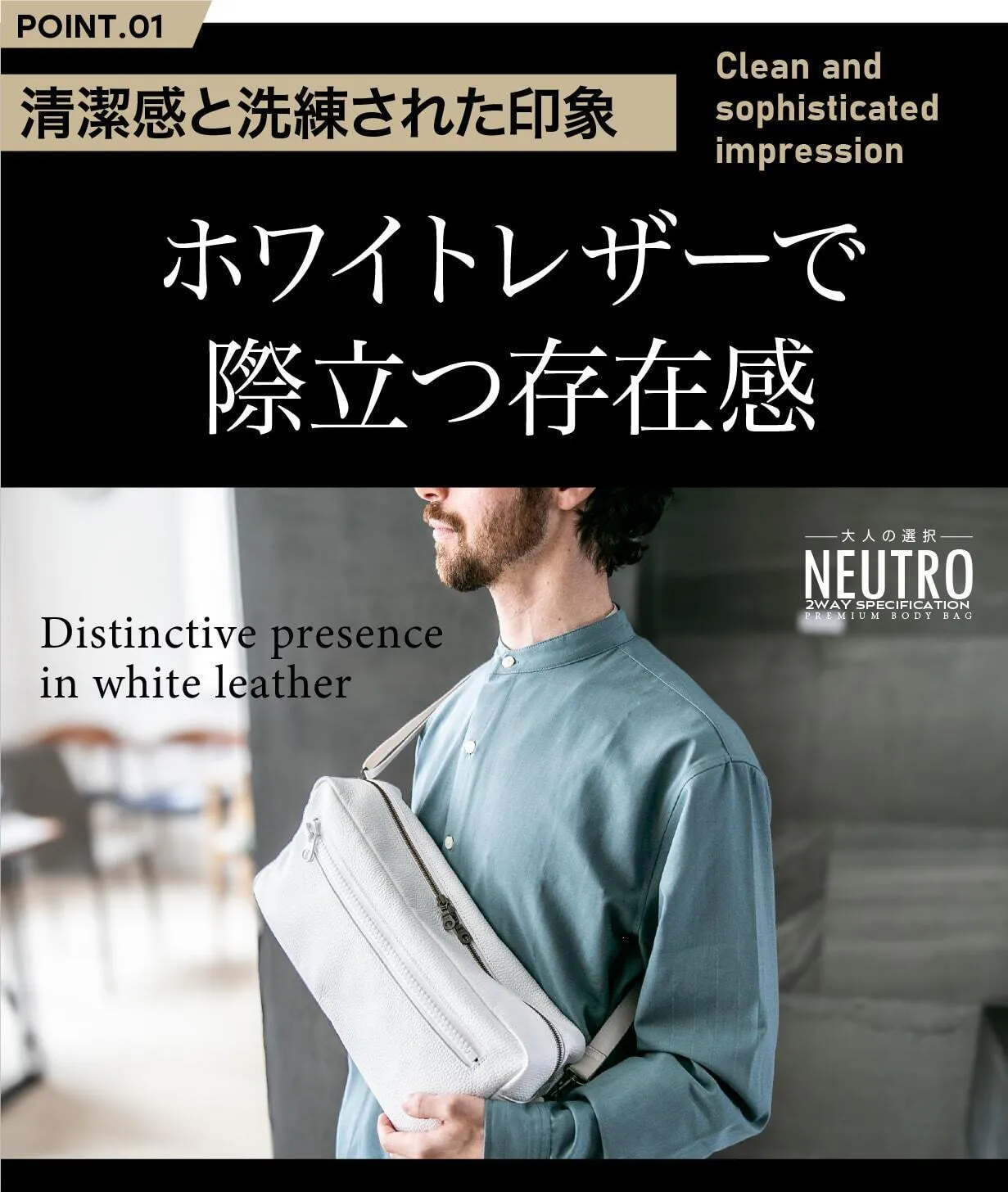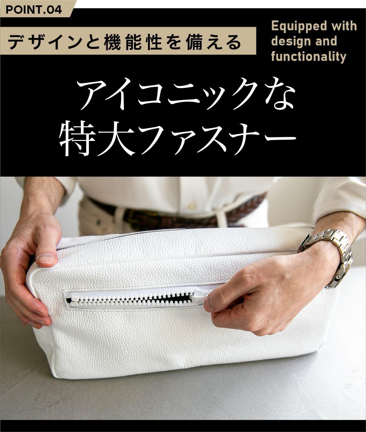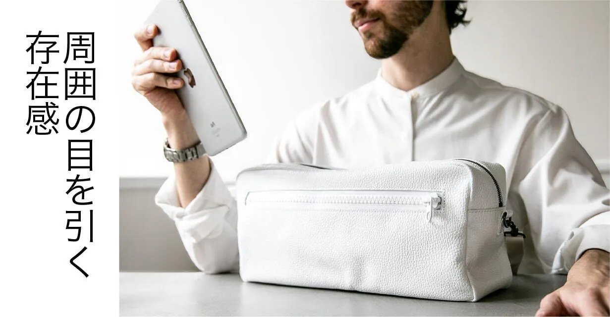 清潔感と洗練された印象を兼ね備えたホワイトレザー。このバッグを持つだけで、あなたの存在感が際立ちます。街中でもひときわ目を引く美しい発色とミニマルなデザインが、大人の男性にふさわしい上品さを演出。撥水加工が施されているので、気軽に日常使いできる機能性も魅力。ホワイトを選ぶことで、洗練された自分を手に入れてみませんか?