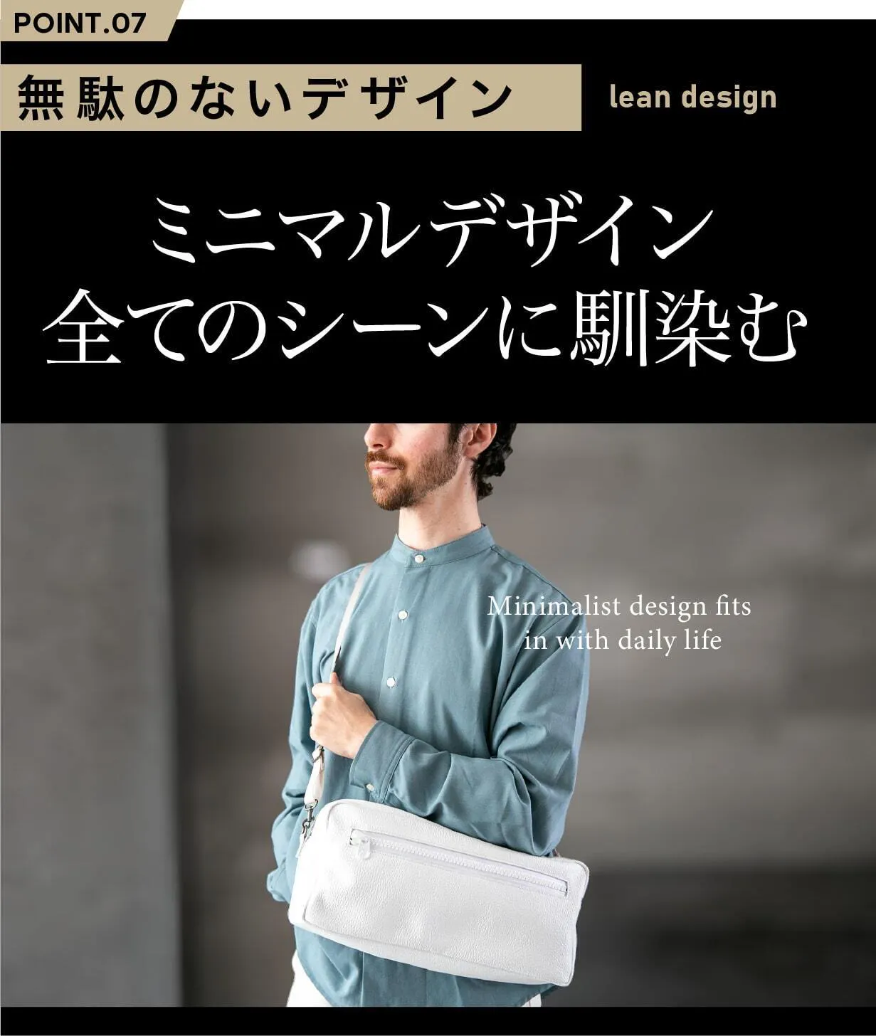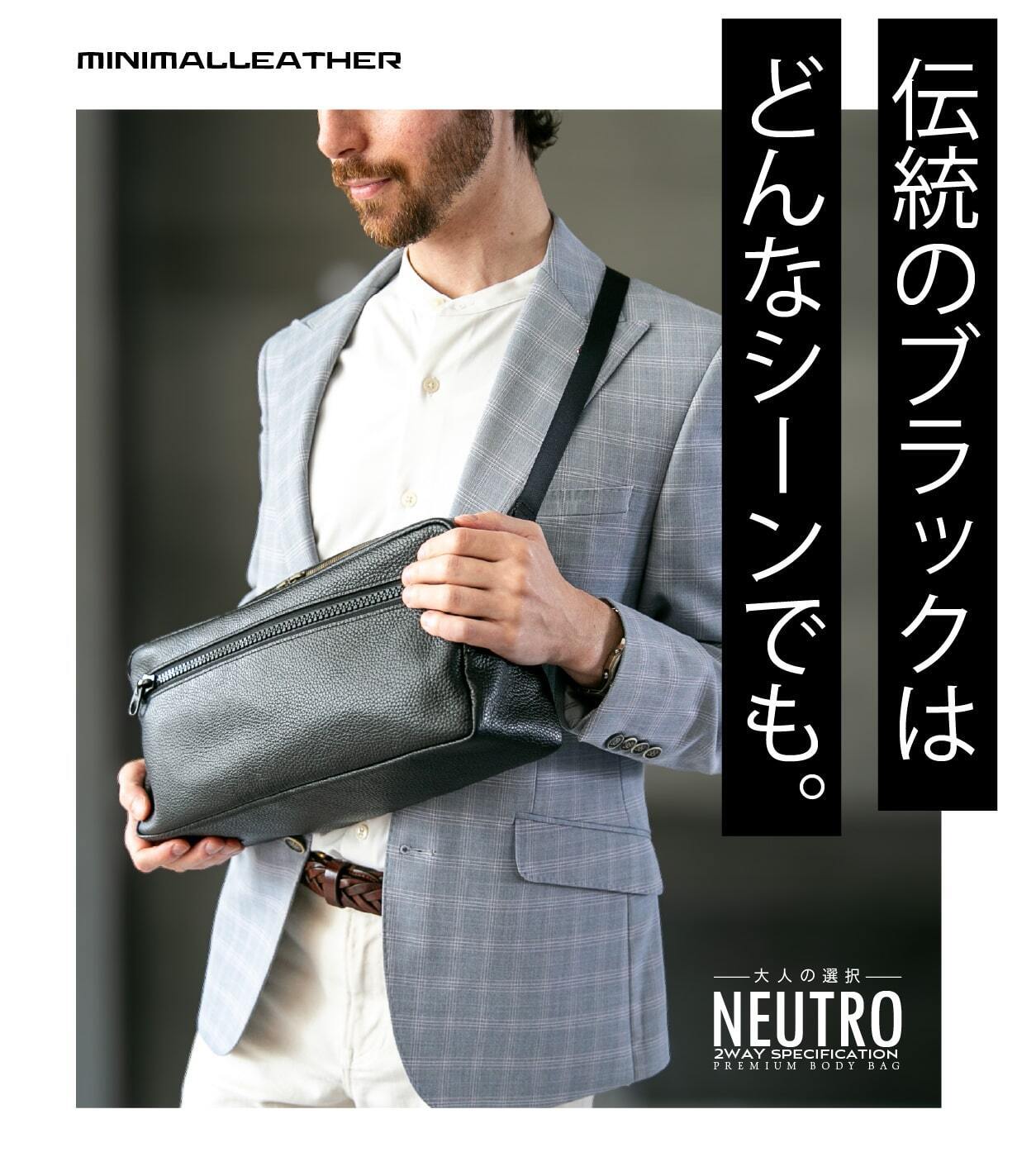 余計な装飾を削ぎ落とし、シンプルさを追求したミニマルデザイン。このボディバッグは、ビジネスシーンでもカジュアルな日常でも自然に馴染みます。