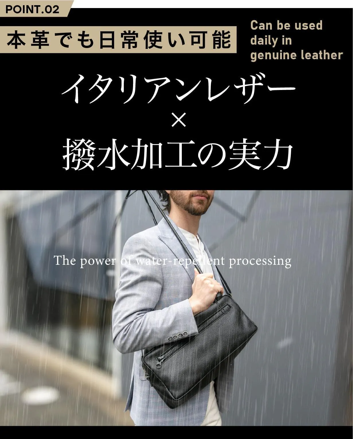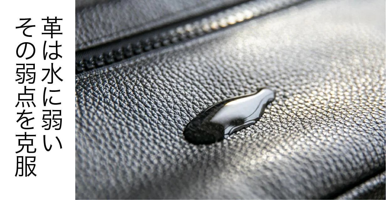 普通の革製品は水に弱いというイメージがありますが、このバッグはその常識を覆します。高品質なイタリアンレザーに撥水加工を施し、雨の日や水滴が気になるシーンでも安心してお使いいただけます。