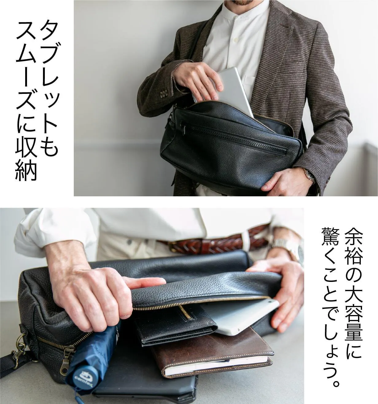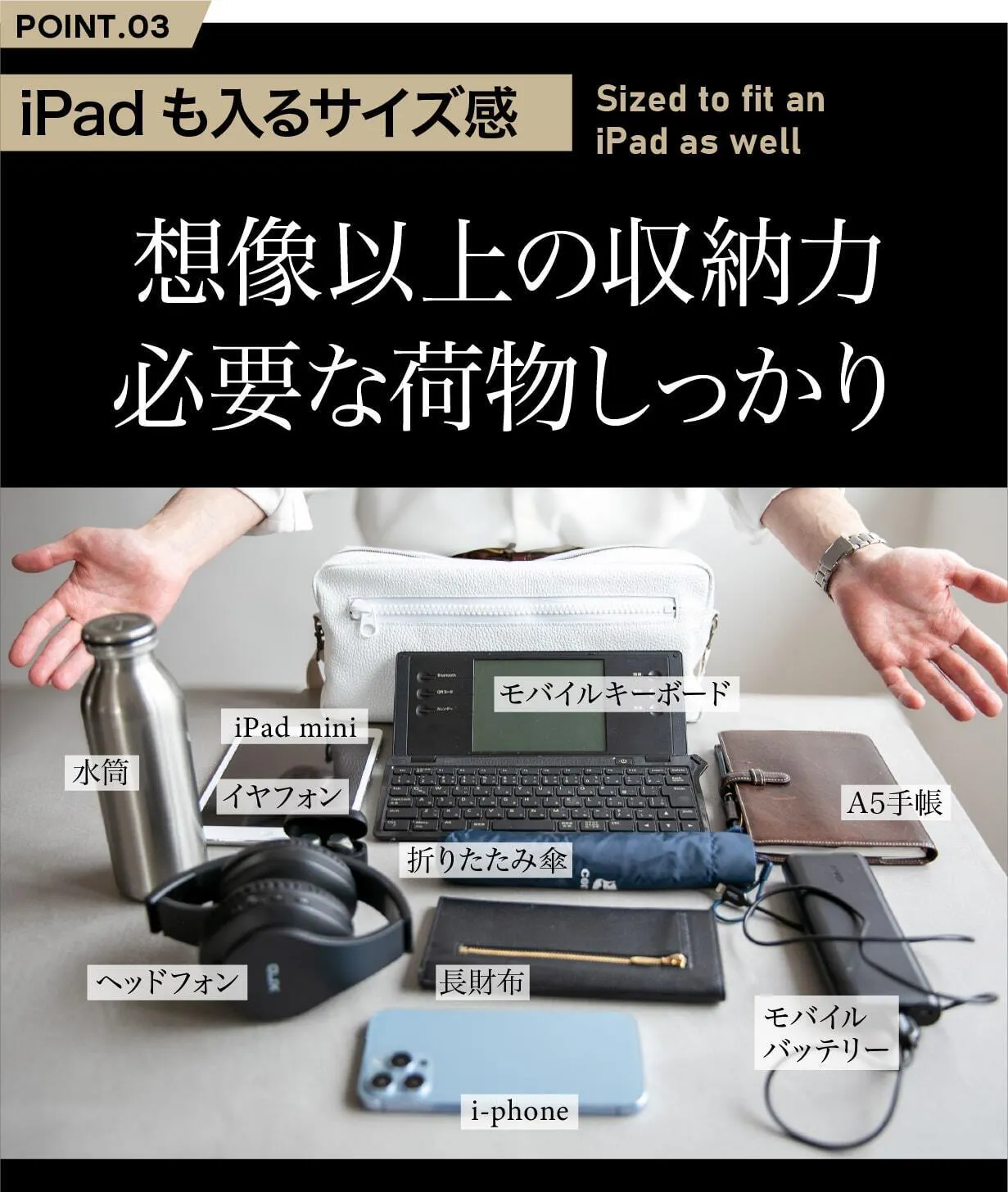 iPadminiや長財布、モバイルキーボード、スマートフォン、モバイルバッテリーまで、必要なアイテムをすっきりと収納できる大容量が魅力。見た目はコンパクトながら、想像以上の収納力で、荷物が多くなる日常でもスマートに対応します。