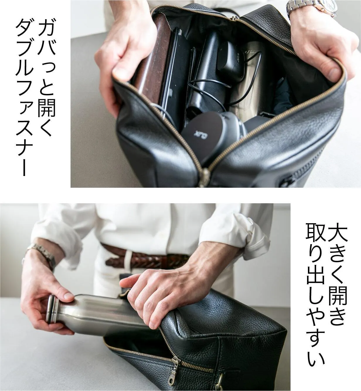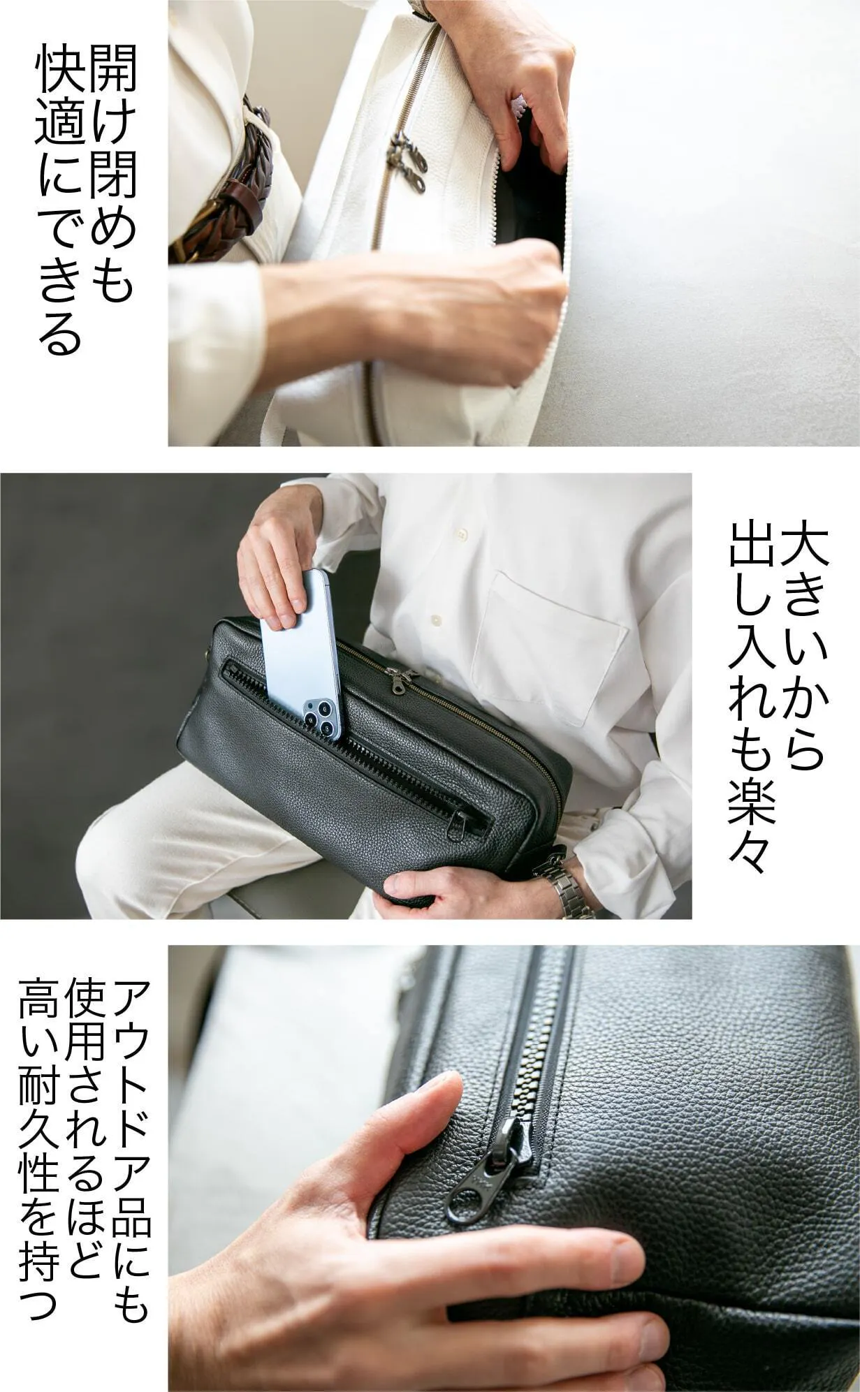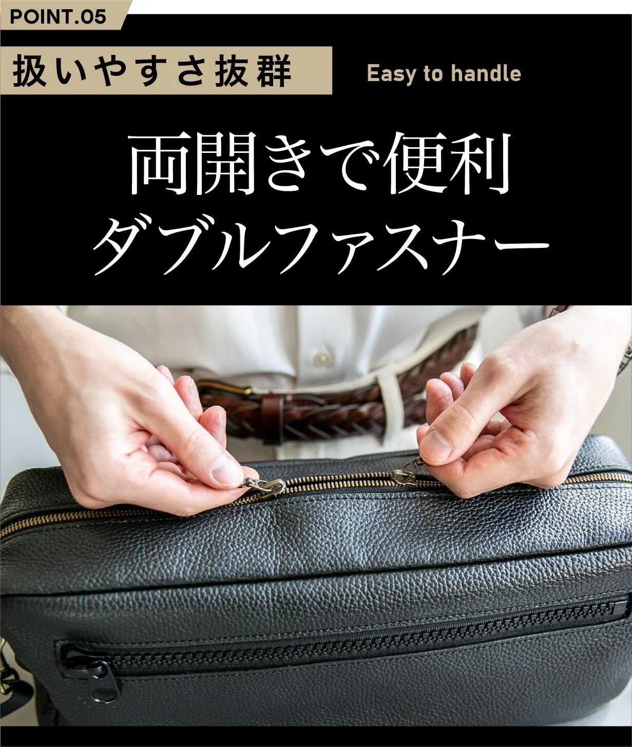 ダブルファスナー仕様で、左右どちらからでもスムーズに開閉可能。使うシーンや持ち方に応じて柔軟に対応できるため、忙しい毎日のストレスを軽減します。