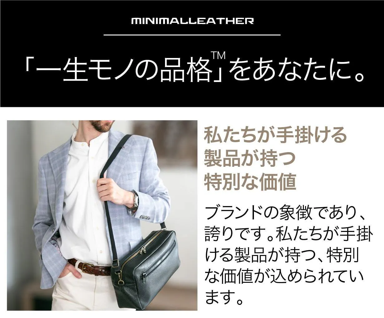 レザーは天然素材ならではの独自の風合いを持ち、使い込むほどに味わい深く変化していきます。時間が経つほどに輝きを増し、持つ人の個性とともに進化するレザーの魅力。それが「一生モノ」の証です。