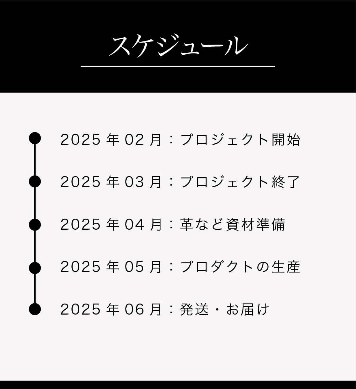 ※本文中に記載させていただいたスケジュールは、あくまでプロジェクト公開時点の予定です。プロジェクトの性質上、配送遅延のおそれがございます。原則として、配送遅延に伴うキャンセルはできませんが、リターン配送予定月から3ヶ月を超えた場合には、希望者に限りキャンセルにて対応させていただきます。