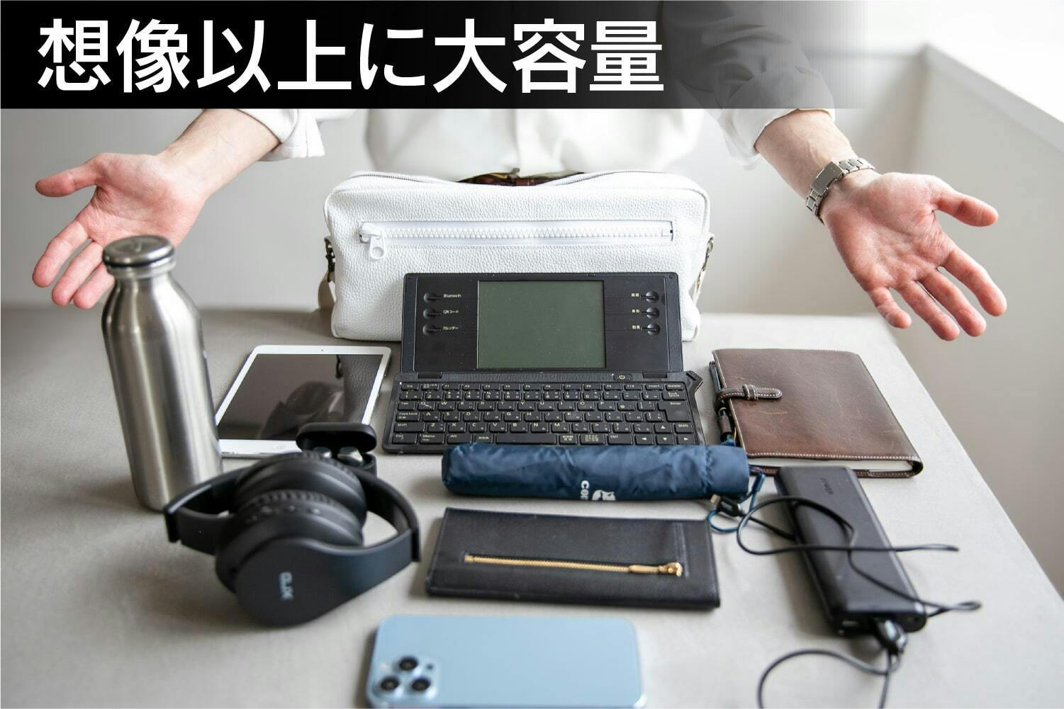 必要なものをスマートに収納できるサイズ感。タブレットやA5ノート、財布、スマートフォンなど、外出時に必要なアイテムがしっかり収まります。