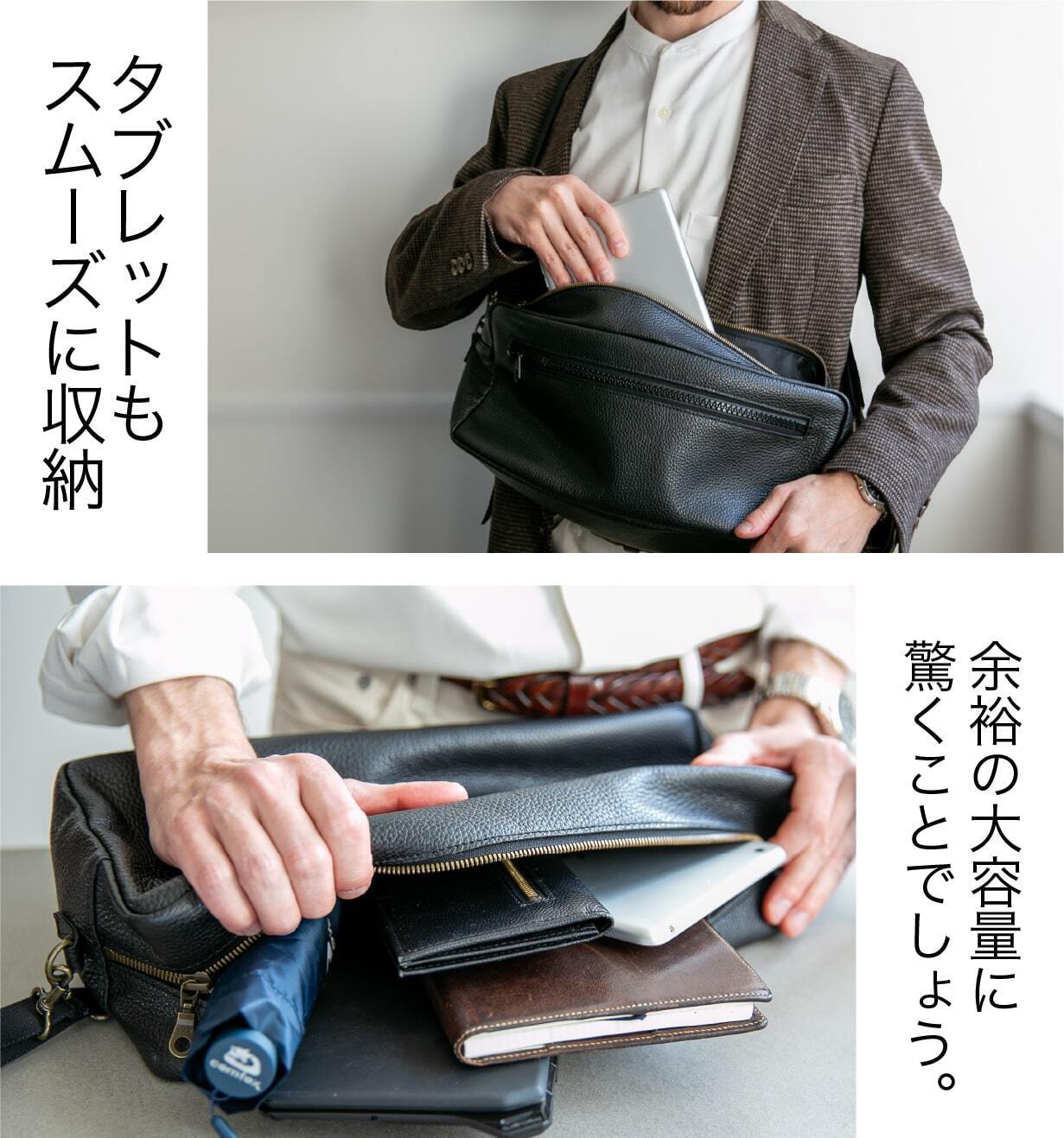 今回の【2WAYレザーショルダーバッグ】は、ビジネスでもカジュアルでも使えるデザインと、撥水加工を施したイタリアンレザーの高級感が魅力。