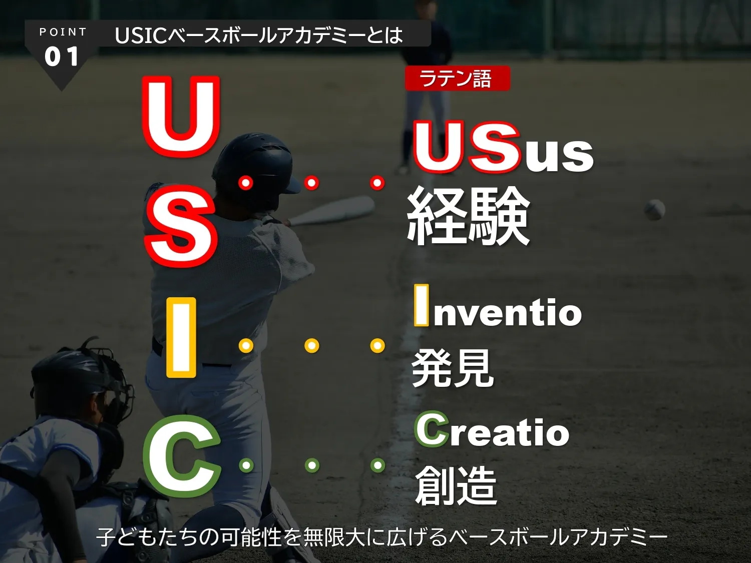 USIC(ウシック)とはラテン語で「経験(Usus)」「発見(Inventio)」「創造(Creatio)」の頭文字を繋げた造語です。まずは何事も挑戦し、失敗も成功も経験することで、新たな発見があり、自らの人生を自ら創造する力を養うことができる。”必ず打順が回ってくる”野球はたくさんのトライ&エラーを経験できる素晴らしいスポーツであると私たちは考えています。