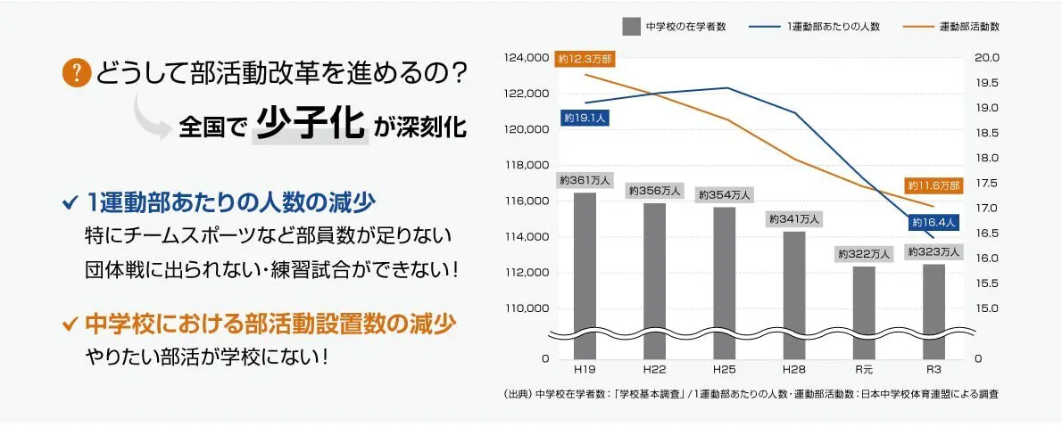 急激に進む少子化や教員の部活動指導の負担増加などにより、中学校・高校の部活動維持が困難になるケースが増えています。文部科学省では、教員の働き方改革の一環として、令和5年度から地域スポーツクラブなどが部活動の運営を引き継ぐ「部活動地域移行」を推進しています。