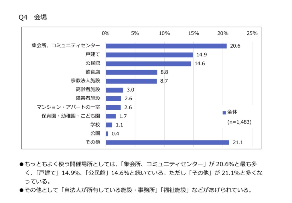 子ども食堂は集会所やコミュニティセンター、公民館や施設での開催が40.8%と大半を占めています。