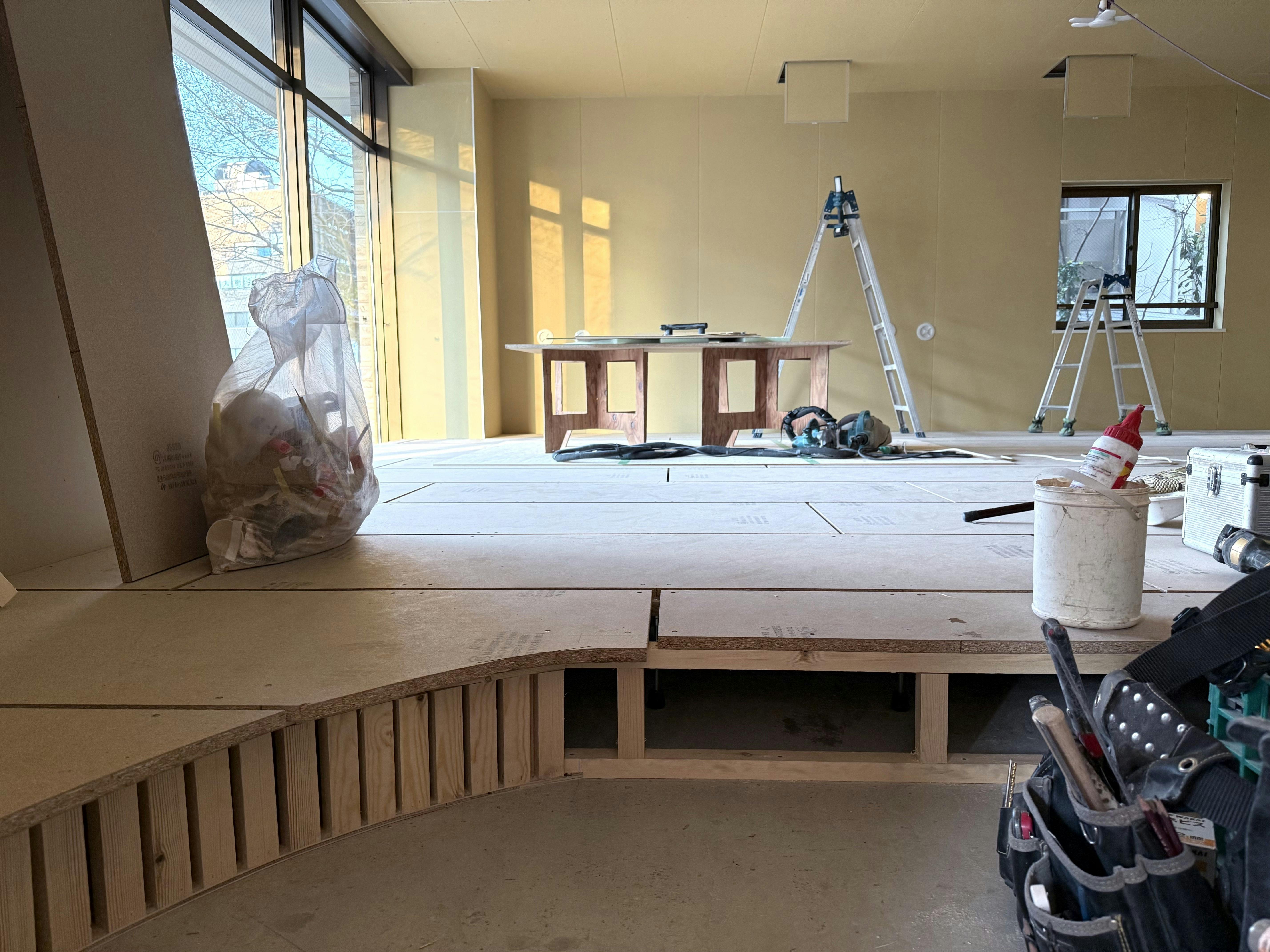 赤ちゃんたちが寒くないように床をあげています。1本1本の材木を丁寧に汲み上げて、大工のさかいさんが床を作ってくれています。