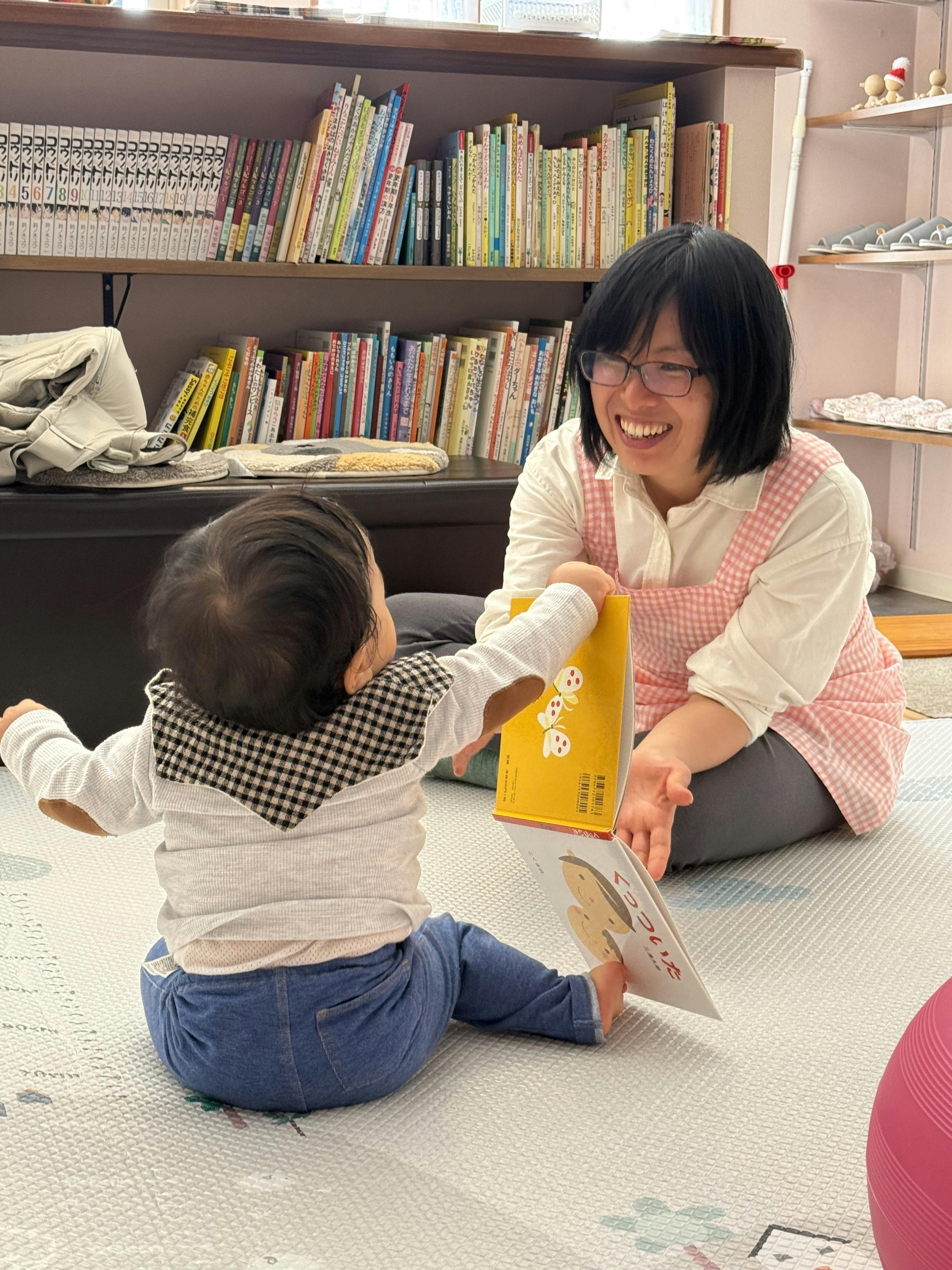 今日は11か月と29日の赤ちゃんとママが産後ケアに来ましたよ。産後ケアは1歳のお誕生日の前日まで使えます。ママがゆっくりお昼ご飯を食べたり、ちょっとお昼寝されている間は、助産師や保育士を遊んでいます。絵本が大好き!次々に絵本をもってきてくれました。「産後ケアの時間」が赤ちゃんにとっても学び多く、温かい時間になるようにしています。