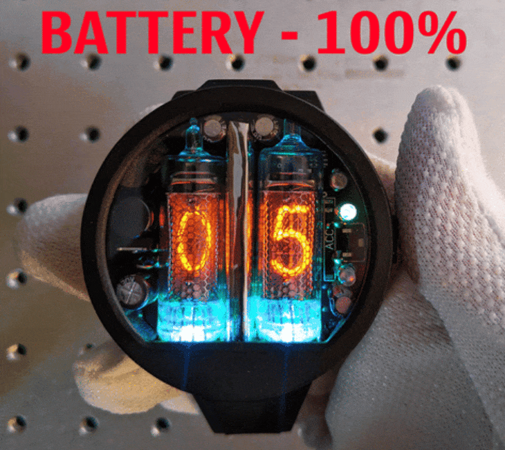 このようにニキシー管バックライトの色を変えることで視覚的にバッテリー残量を確認できるようになっております。