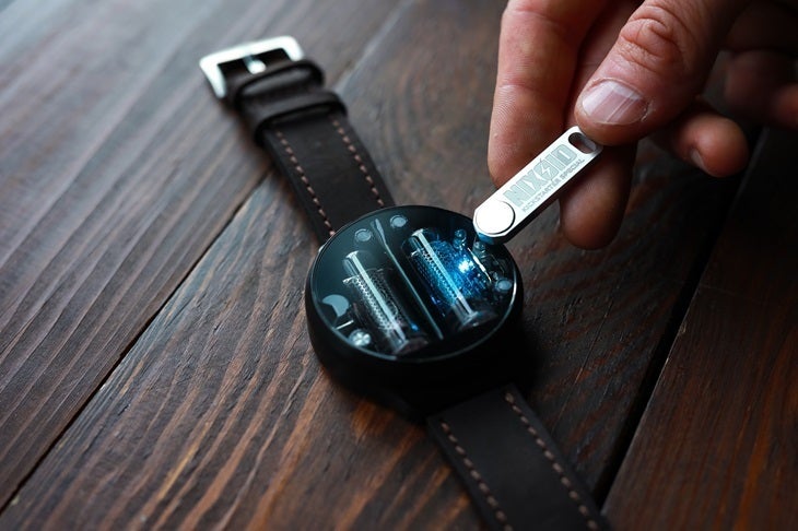 ニキシー管のレトロな雰囲気を際立たせるようにメタルでメカニクルなデザインを追求しました。今回のプロジェクトでは、メカニクルなデザインにピッタリの特別仕様メタルベルトでお届けします。