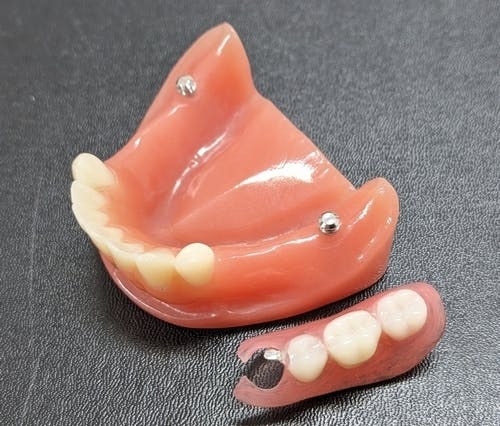 4歯程度の少数歯欠損(上段画像)、9歯以上の多数歯欠損(下段画像)にも1本のインプラントで対応可能です。1本のインプラントでしっかり噛める最大のメリットは身体への負担ならびに費用の軽減です。通常は最低2本以上の複数のインプラントが必要でした。デンチャーインワン®の場合は1本でも歯が残っていれば1本のインプラントで安定に優れたインプラントオーバーデンチャーにすることが出来ます。その理由は、エンジニアリングプラスティックという高弾性かつ強靭な歯科材料のデンタエンプラTUMを採用したことにあります。