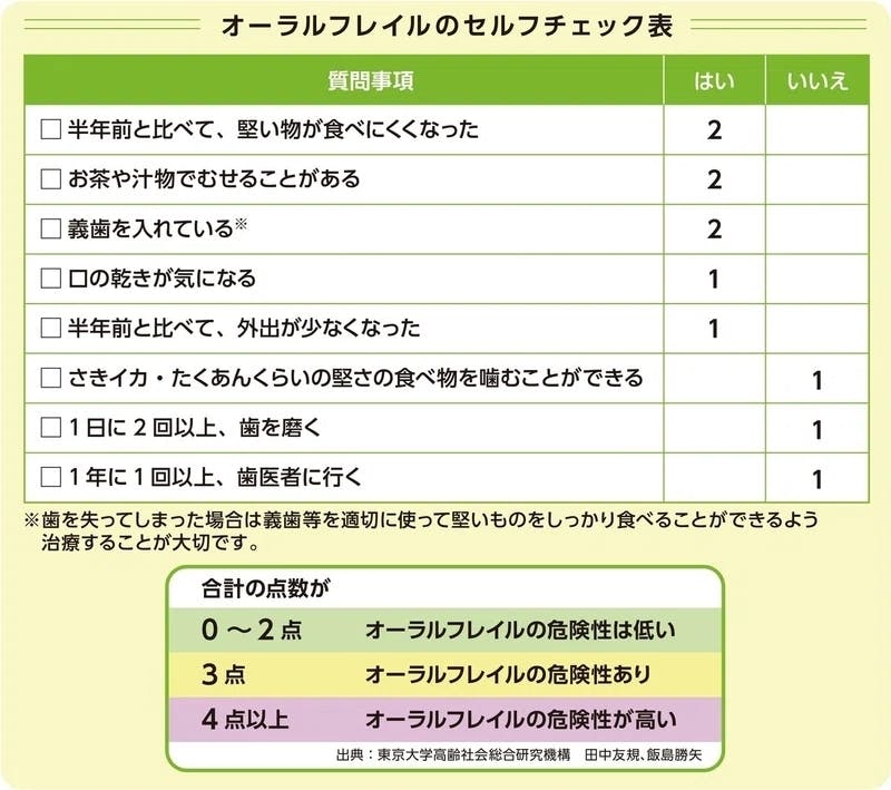 ※「はい」と「いいえ」の合計点数が3点以上でオーラルフレイルの危険性ありと判断されます。入れ歯を装着している方は2点カウントされます。ただし、入れ歯でも自分の歯のように食べることができる場合には問題ありません。歯を失った場合には咀嚼機能の回復がオーラルフレイル予防にとって重要です。