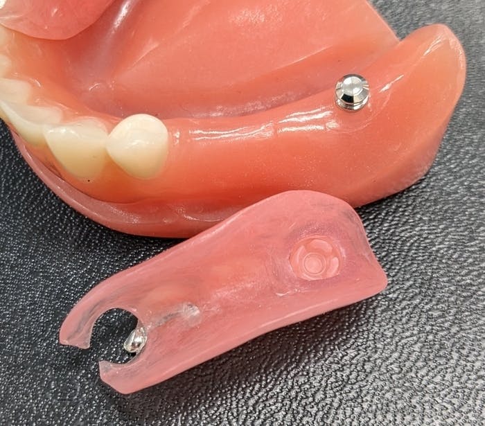インプラントオーバーデンチャーの場合は自分で取外すことができるためインプラントブリッジに比較してインプラントの周囲の清掃が容易です。さらに、デンチャーインワン専用フィメールには静菌AD-PSJを添加した静菌タイプを採用しているので、より高い清潔性が期待できます。