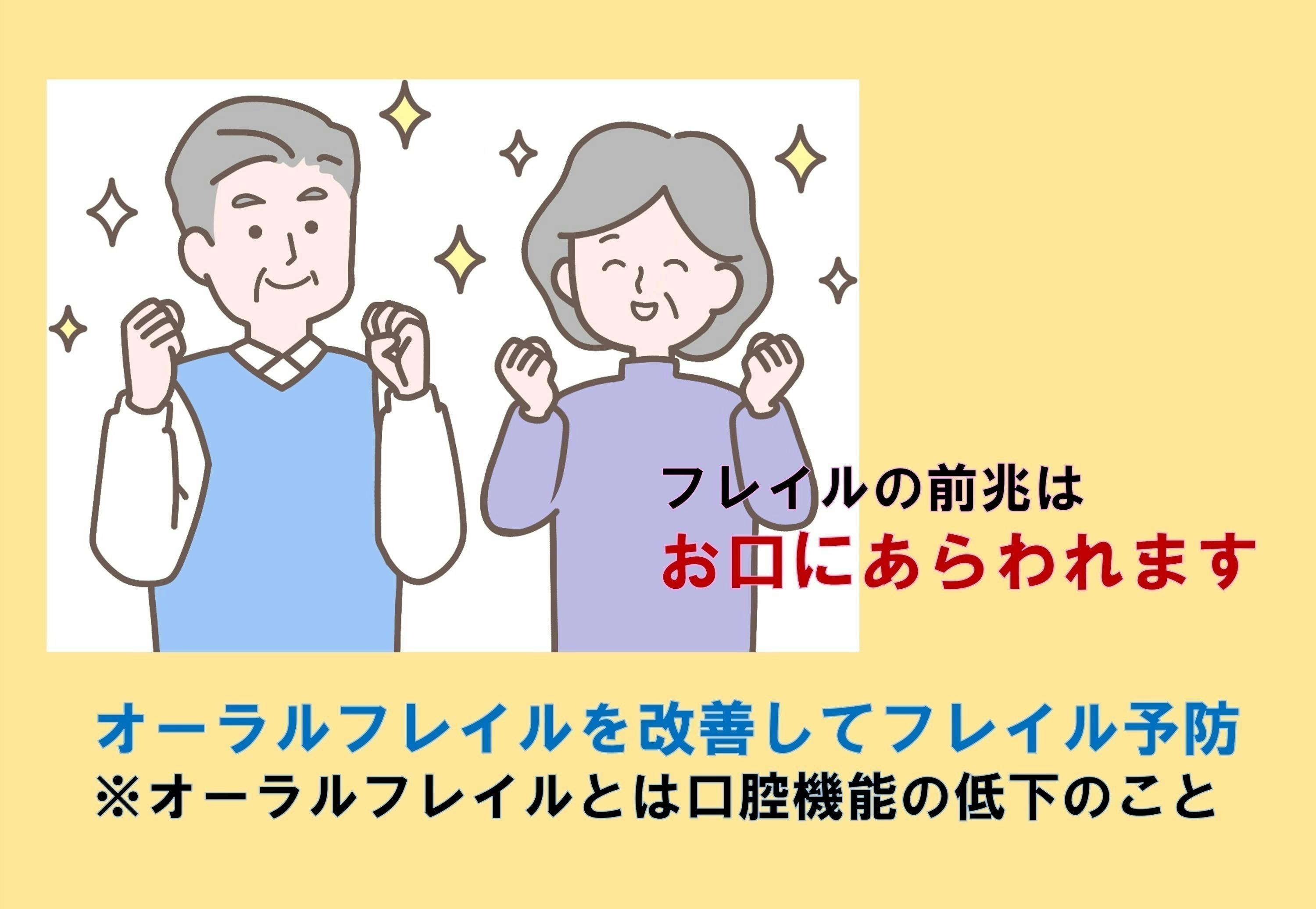 全身状態が虚弱することをフレイルと言います。フレイルとは、わかりやすく言えば「加齢により心身が老い衰えた状態」のことです。フレイルは、早く介入して対策を行えば元の健常な状態に戻る可能性があります。歯科にはオーラルフレイルという言葉があり、オーラルフレイルは口の機能の健常な状態と、口の機能低下との間にある状態(未病)です。オーラルフレイルは将来のフレイル、要介護認定、死亡のリスクが高いということがわかっており、フレイル予防のために必要なこととしてオーラルフレイル予防は重要と言えます。