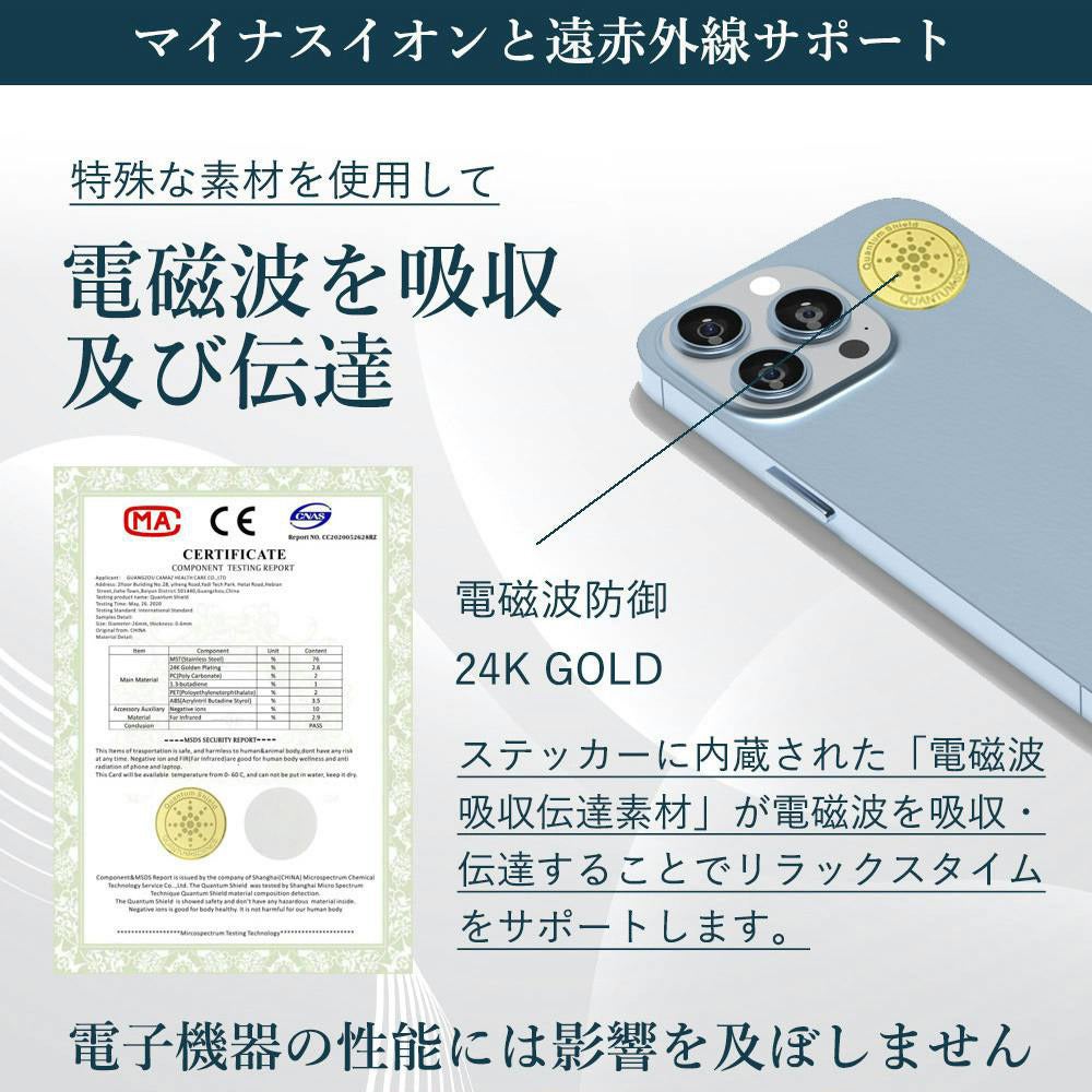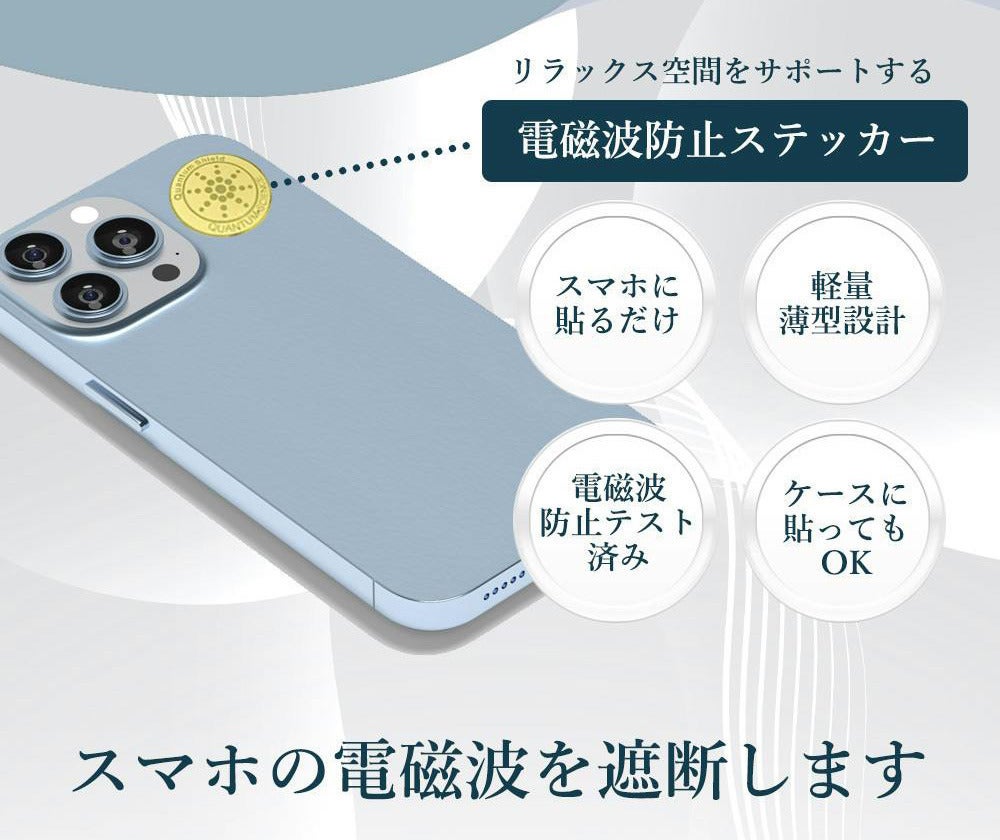 ①スマホに貼るだけ。ケース上からでもOK。②電磁波防止テスト済み。リラックス空間をサポート。③電磁波対策で快適睡眠。