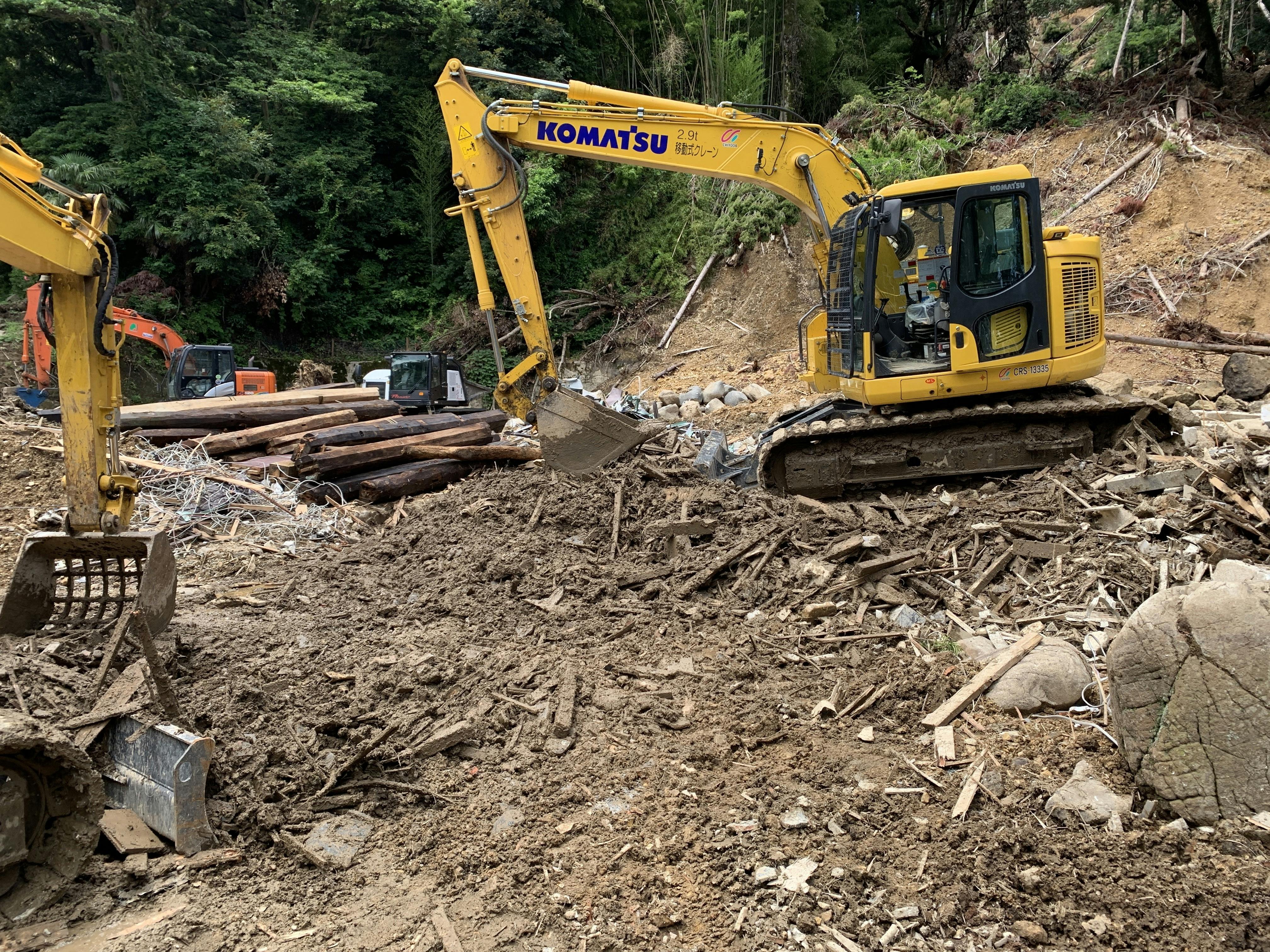 土砂に埋まった弊社の重機は半年たった今も掘り出すことが出来ず、土砂の上に仮設道路を作って作業しています。また掘り出しても今後の使用が出来ないと判断されました。
