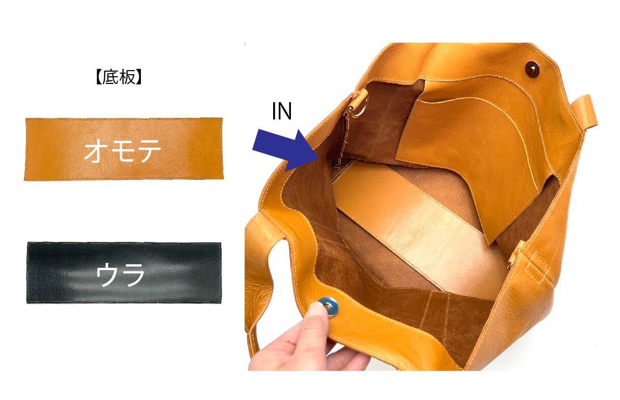 底板の表はバッグと同じデッドストック革を、裏は帽子のつばや靴の底芯などに使用されるしっかりとしたポリエチレンの発砲シートを張り合わせて、縫製をいれました。これで少し重い荷物でも型崩れの防止になります。