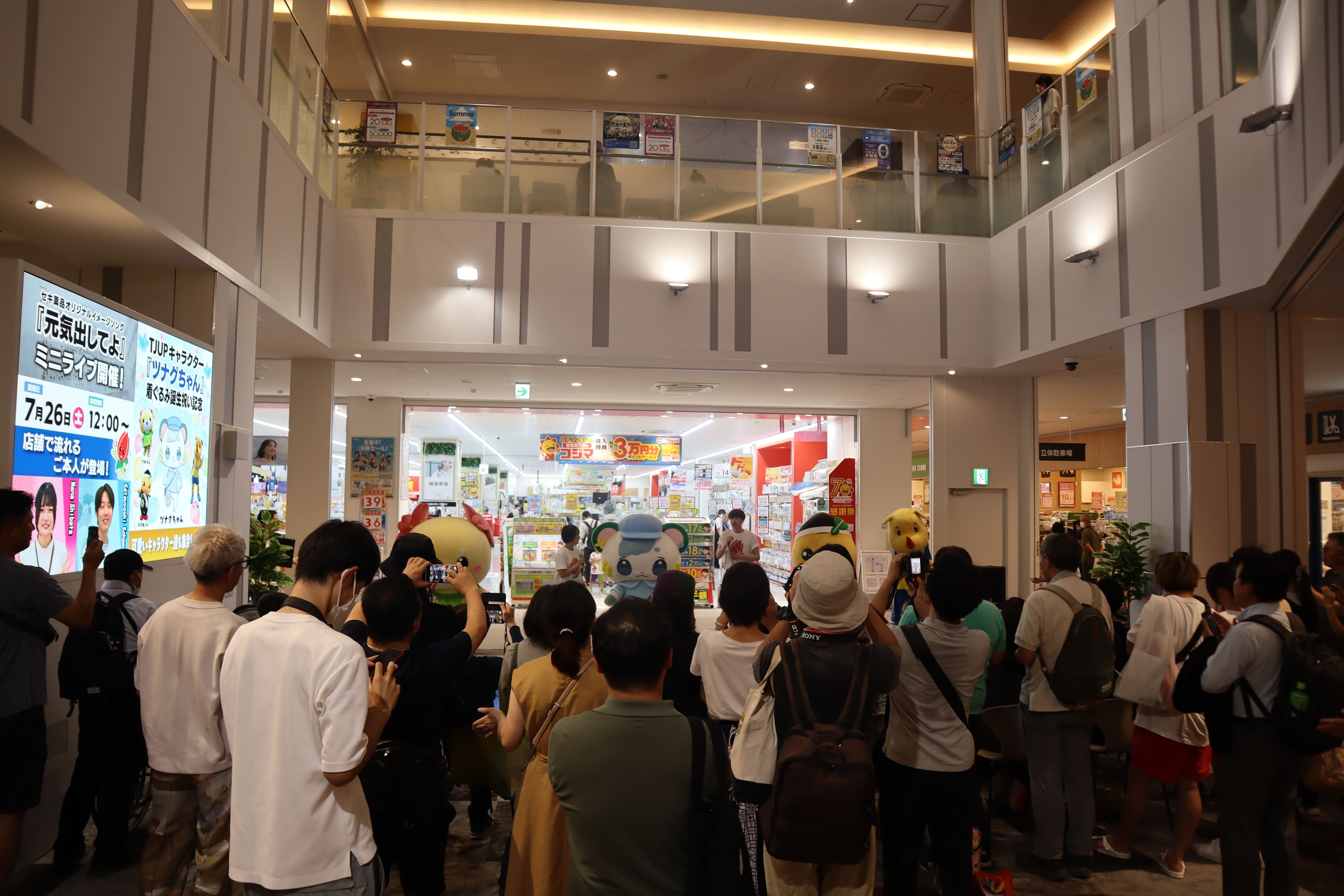 お披露目会の後にはさっそく公の場デビューをしました。セキ薬品「元気出してよ」歌手のお二人が駆け付け、ツナグちゃん着ぐるみ誕生記念のミニライブを開催しました!ミニライブは約100名の方々にご観覧いただきました!