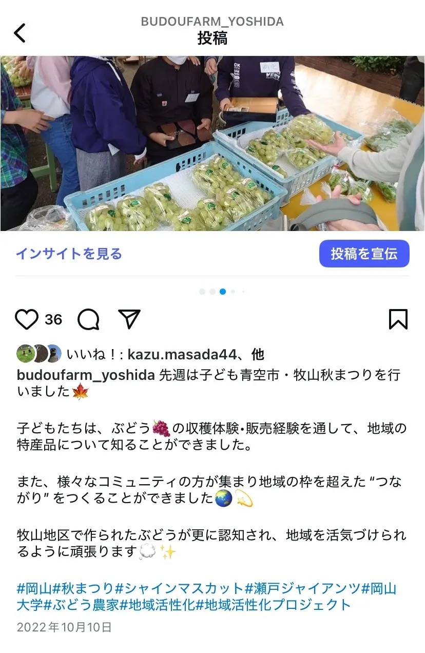 2022年度には、岡山大学大学院の学生と協力して市内の子どもたちを対象にぶどう収穫体験やぶどう祭りを開催しました。