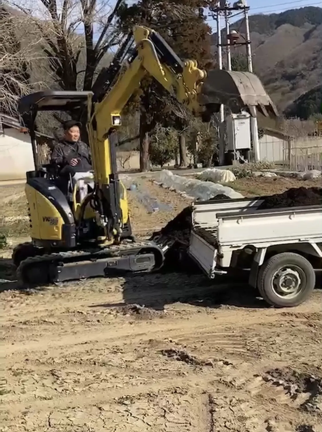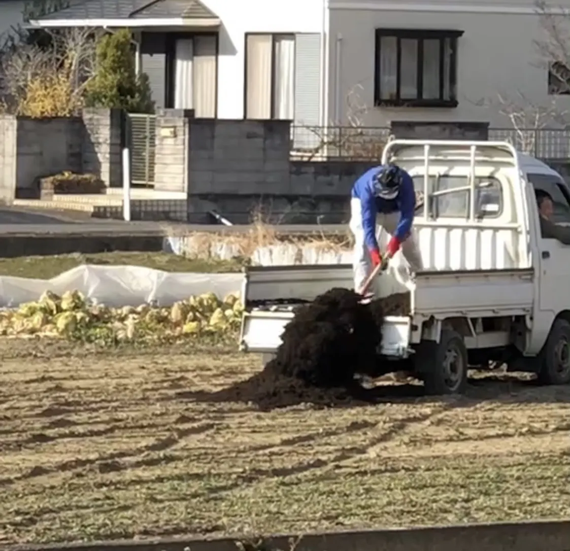 ユンボで掘りながら堆肥を混ぜ込みます