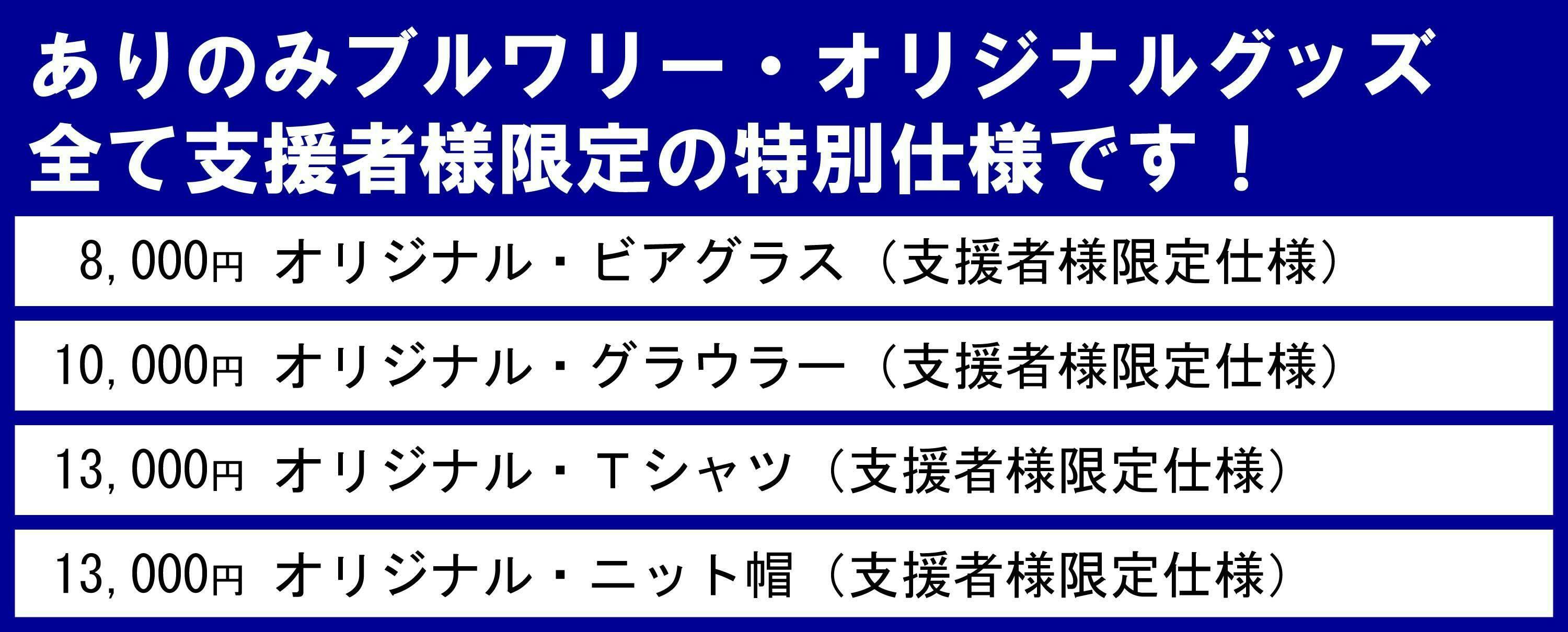 ※支援者様限定仕様のグッズに関して、製作最小ロットに対して支援者数が下回った場合、余ったグッズはビール工場の開業にあたってご協力いただいた方にお配りする可能性があります。