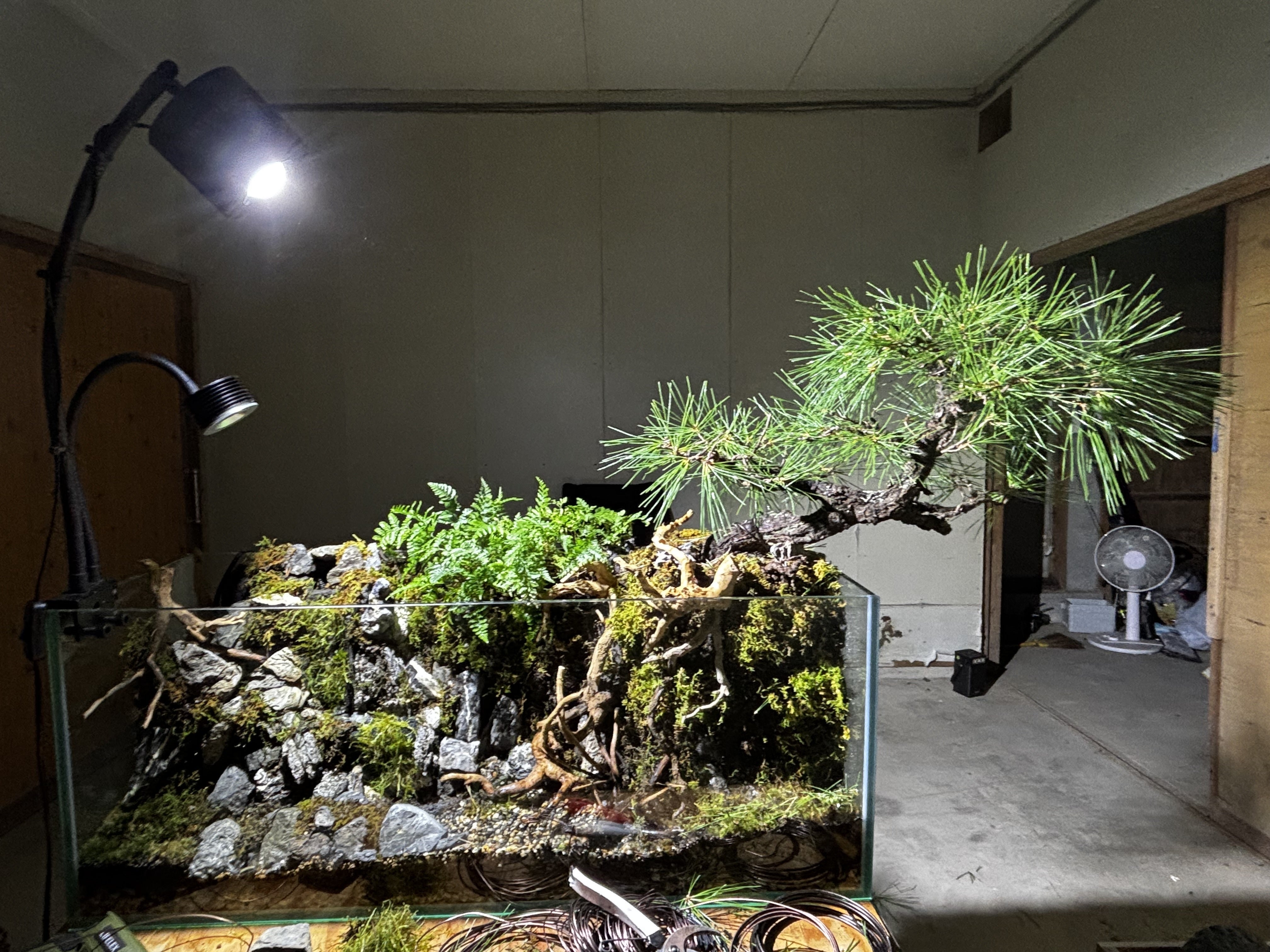 滝が流れる様子とコケの成長を楽しめます!また、盆栽を植えることも可能でより日本の美意識を水槽に詰める作品も販売します!