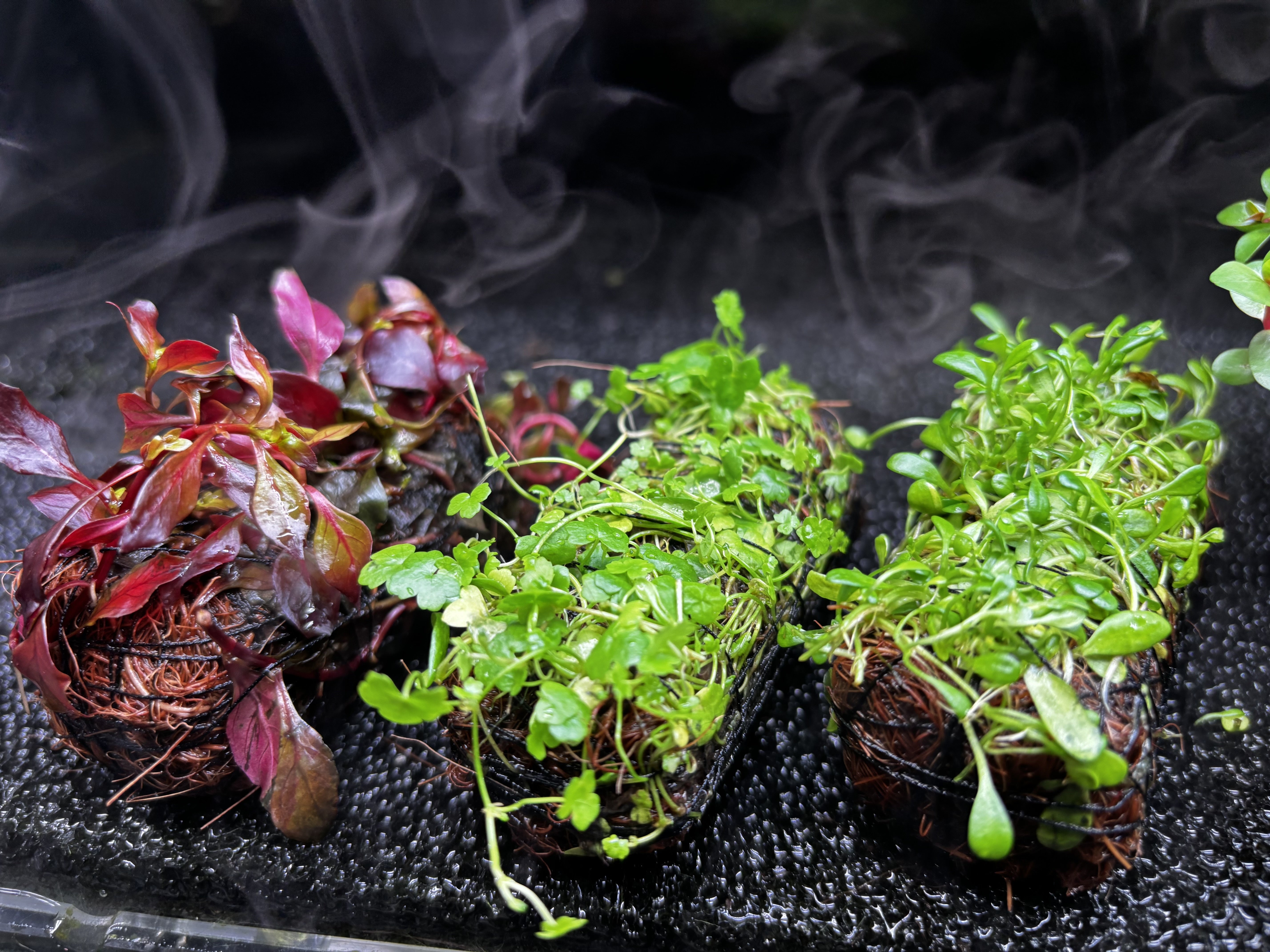 水槽と同時並行で自家製水草を作成して販売します。自社では土玉に水草を巻きつけて、簡単に沈めて植栽できる水草を20種類以上販売する予定です。