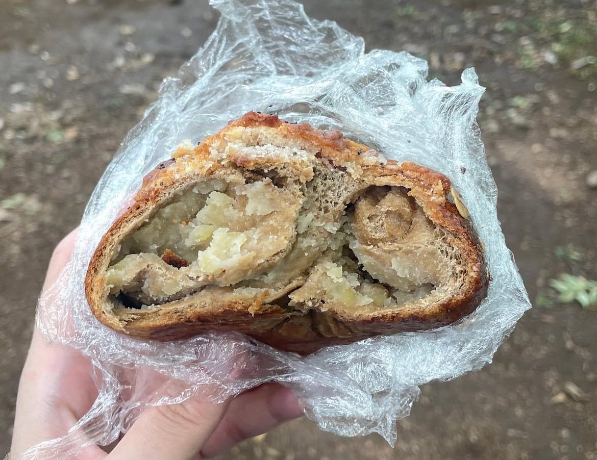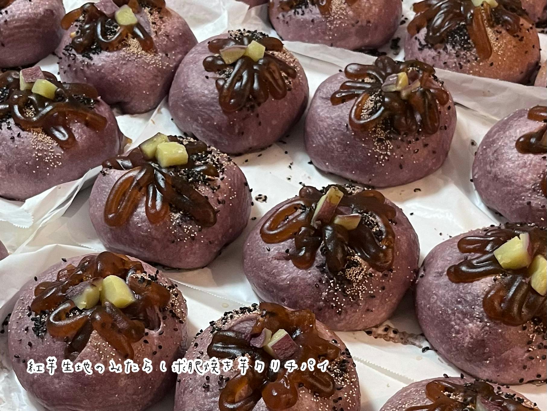 香ばしい香りの黒胡麻生地にじっくりとオーブンで焼いた甘〜い紫芋餡子と香ばしくバター香るさつまいものカラメル塩バターをゴロリと巻き込み