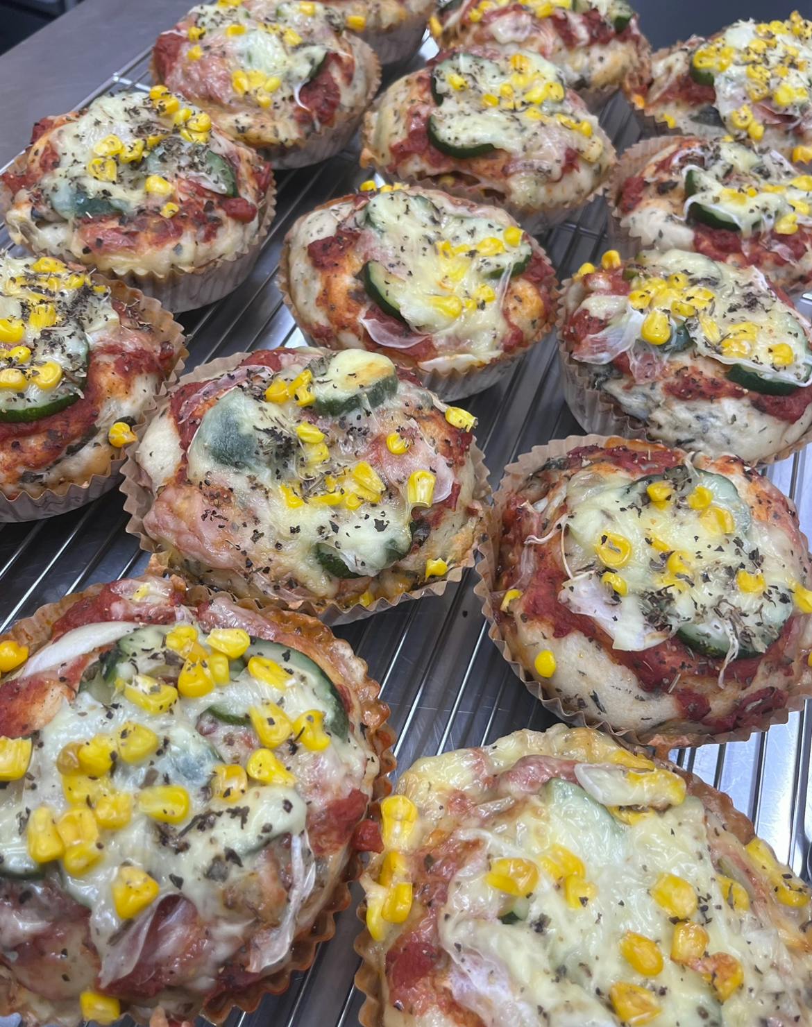 野菜たっぷりのボリューム満点ピザベーグル。生バジルを生地にたっぷり練り込んでます。