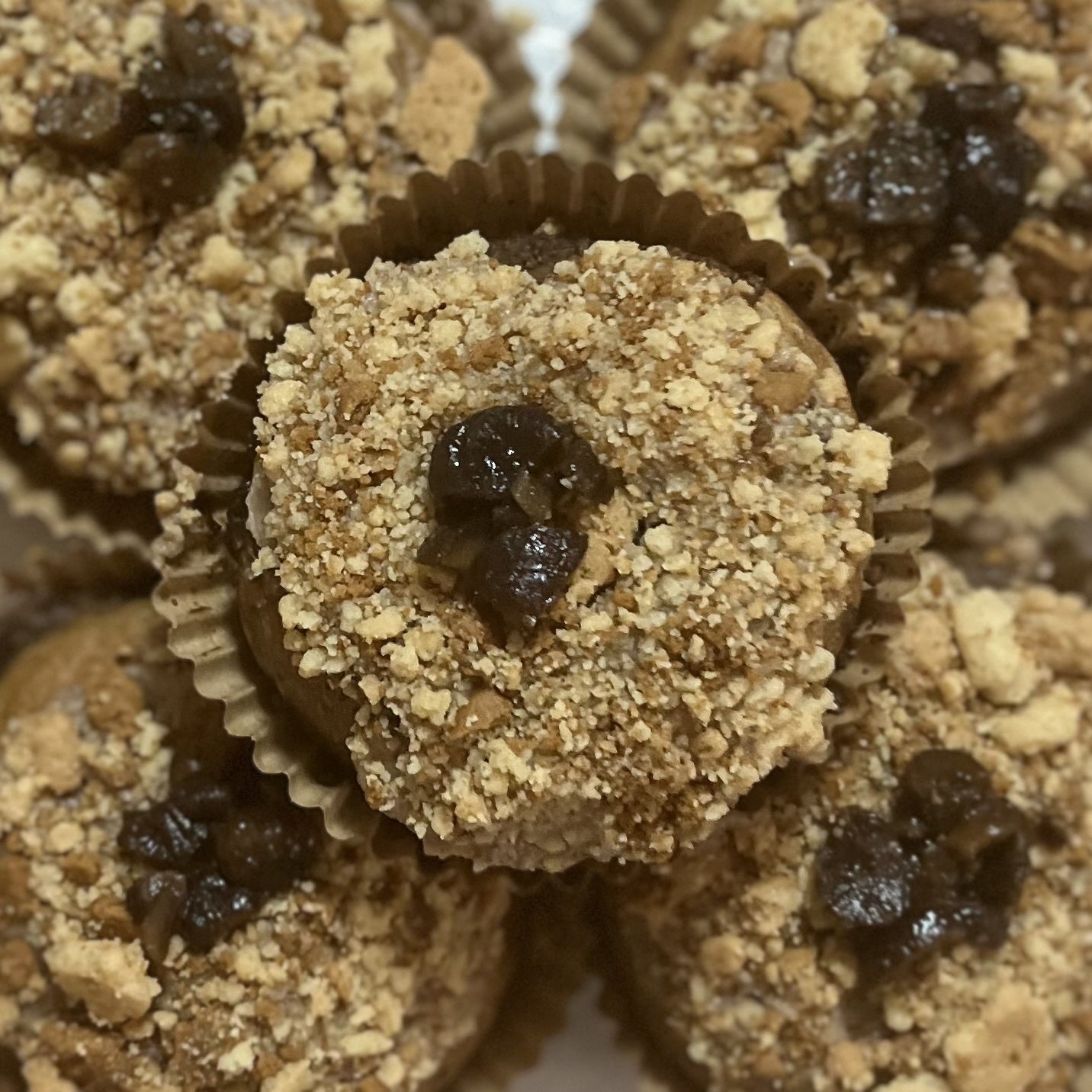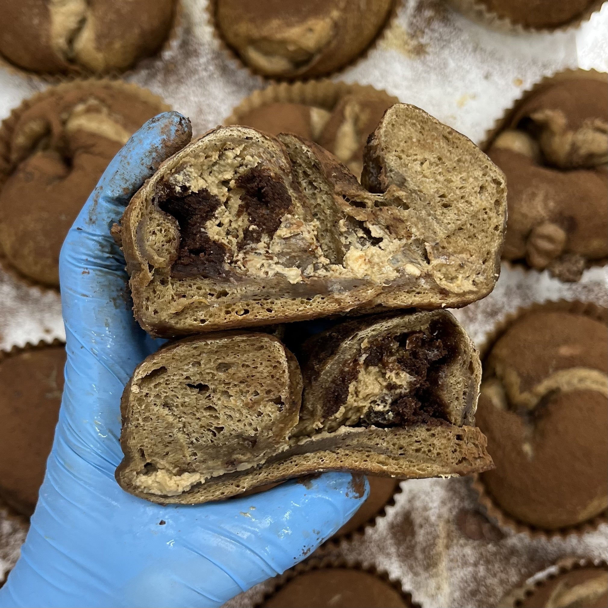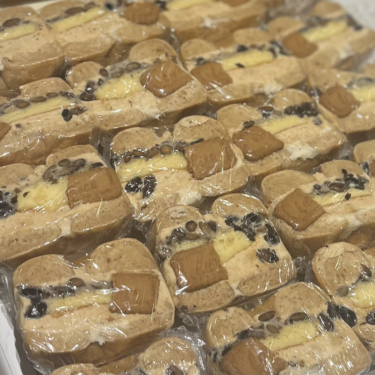 たっぷりのコーヒーを使用したコーヒーベーグルにオリジナルピーナッツクリームに登場頻度高めの砕いたロータスとアーモンドダイス。クリームはピーナッツとキャラメルカスタードベースで作りました。ピーナッツ強いです。