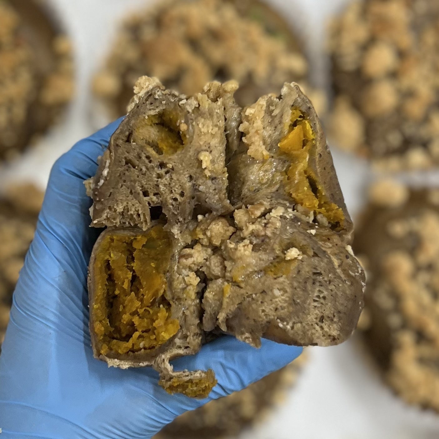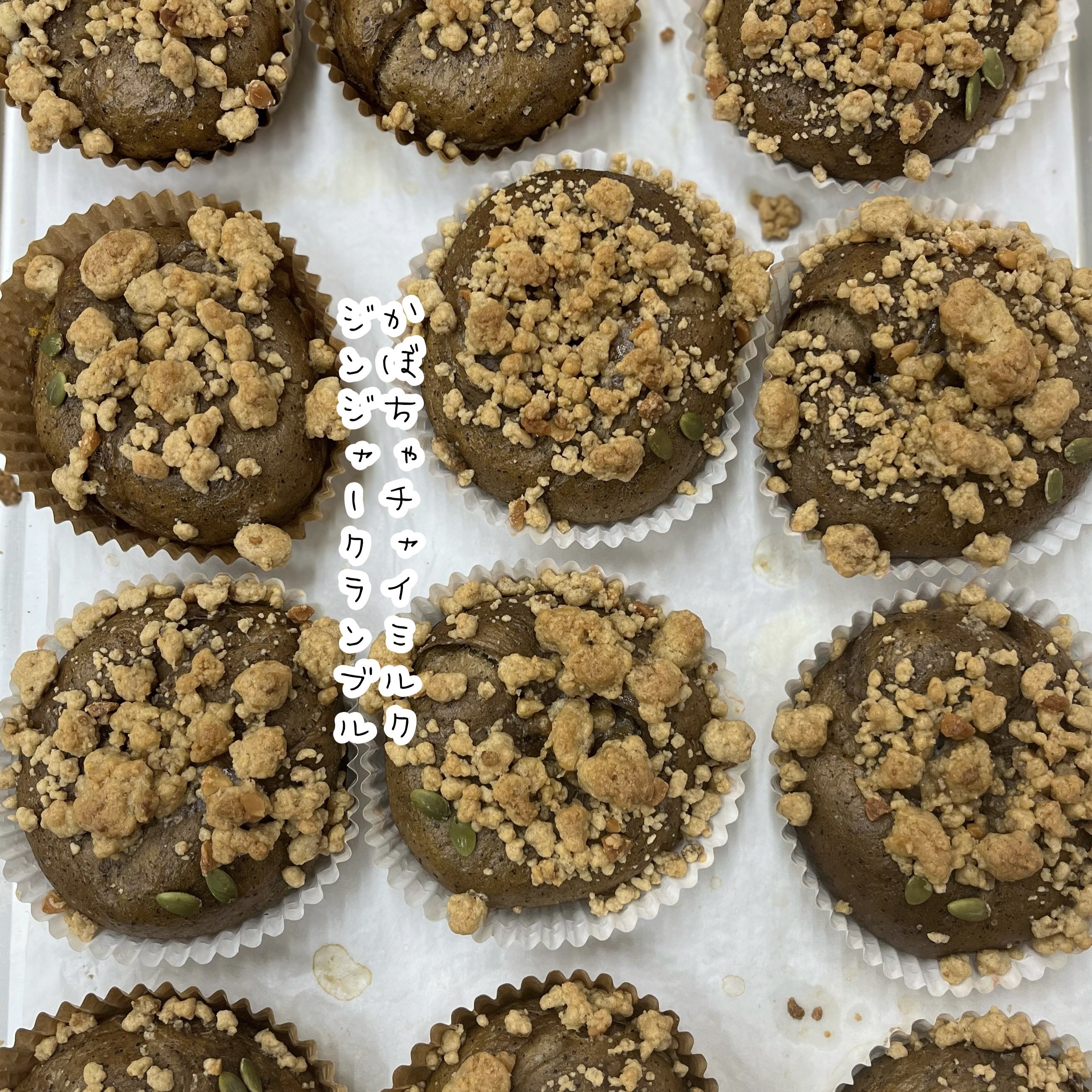 香り豊かなセイロン紅茶生地にかぼちのみを潰しシナモンやジンジャーパウダー、オールスパイス、カルダモン、ナツメグ、クローブなどをブレンドして四葉バターを少し加えて作った餡子とホワイトチョコを巻き込み。ジンジャーとシナモンをブレンドしたクランブルをトッピングしました。スパイスと紅茶香るかぼちゃベーグル