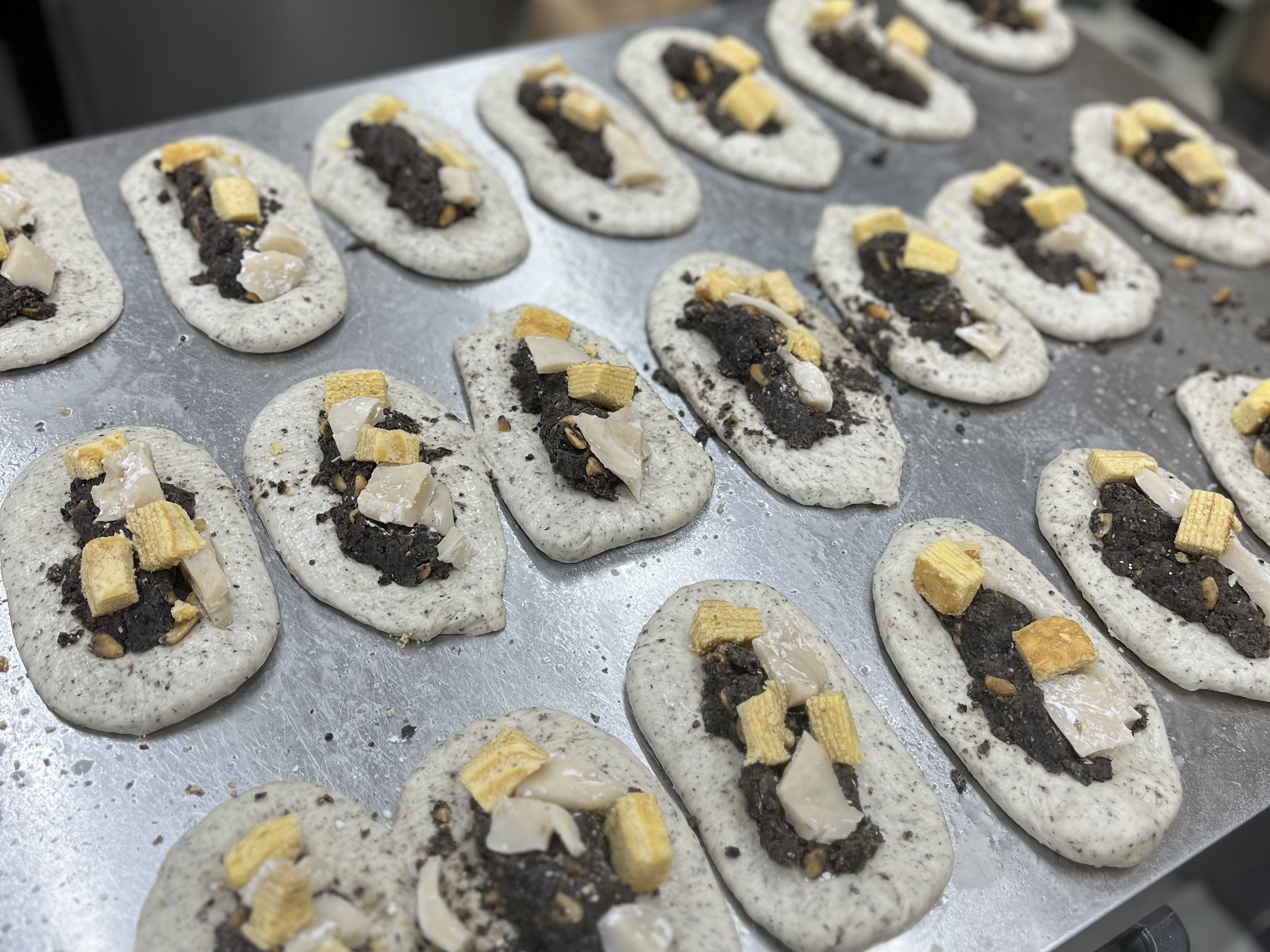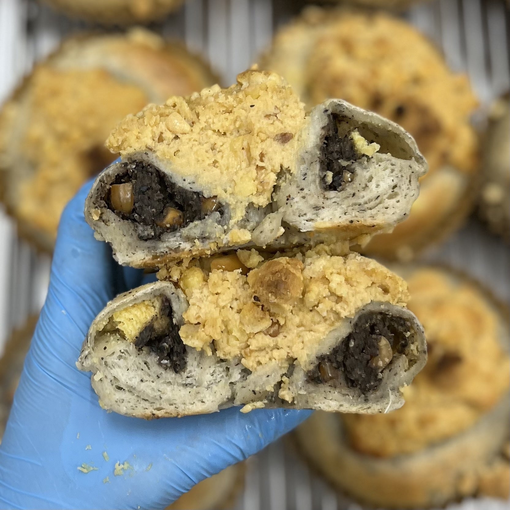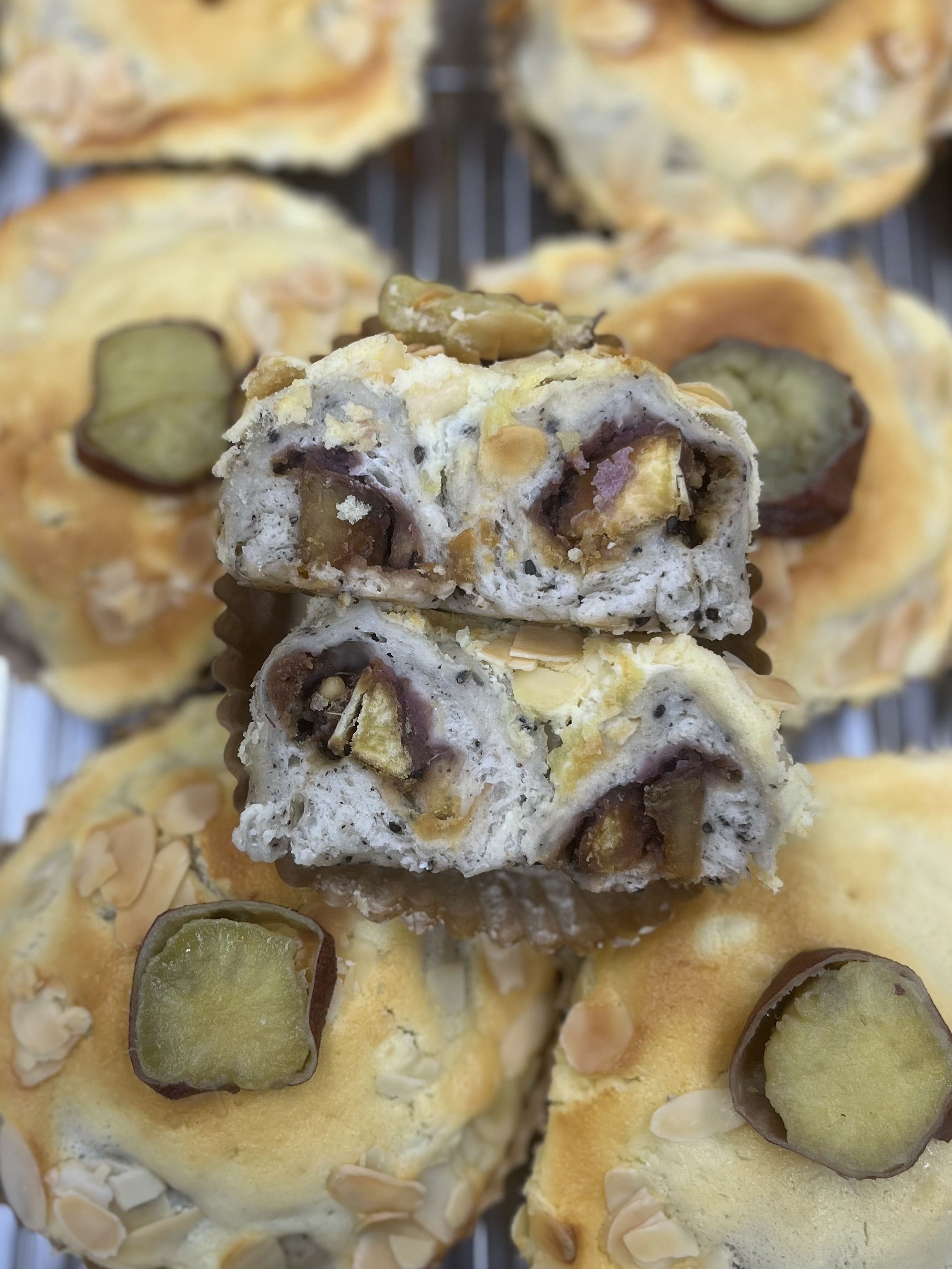 香ばしい香りの黒胡麻生地にじっくりとオーブンで焼いた甘〜い紫芋餡子と香ばしくバター香るさつまいものカラメル塩バターをゴロリと巻き込み