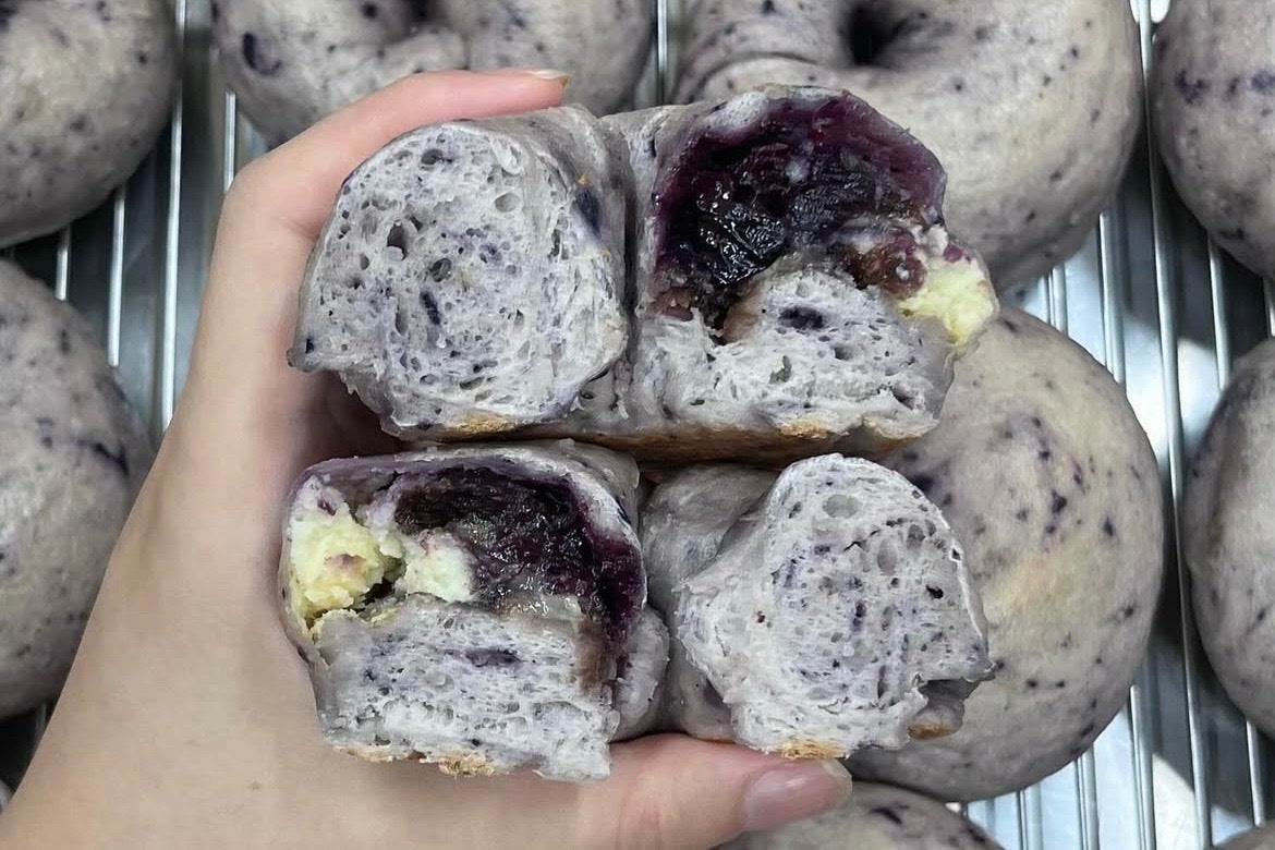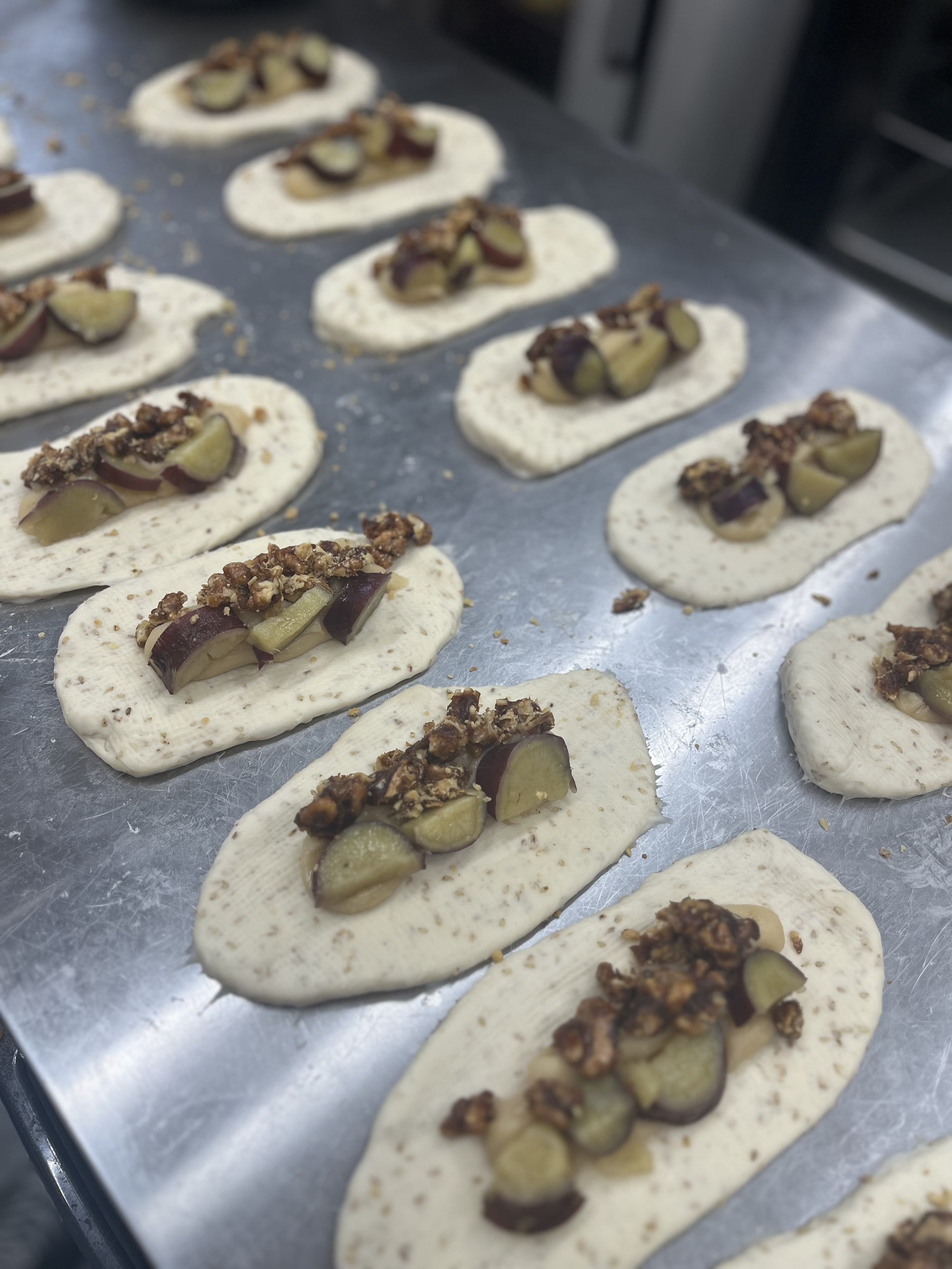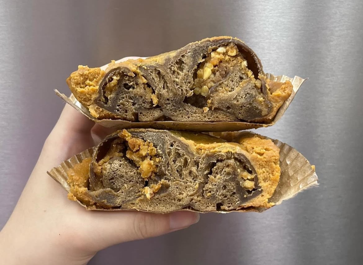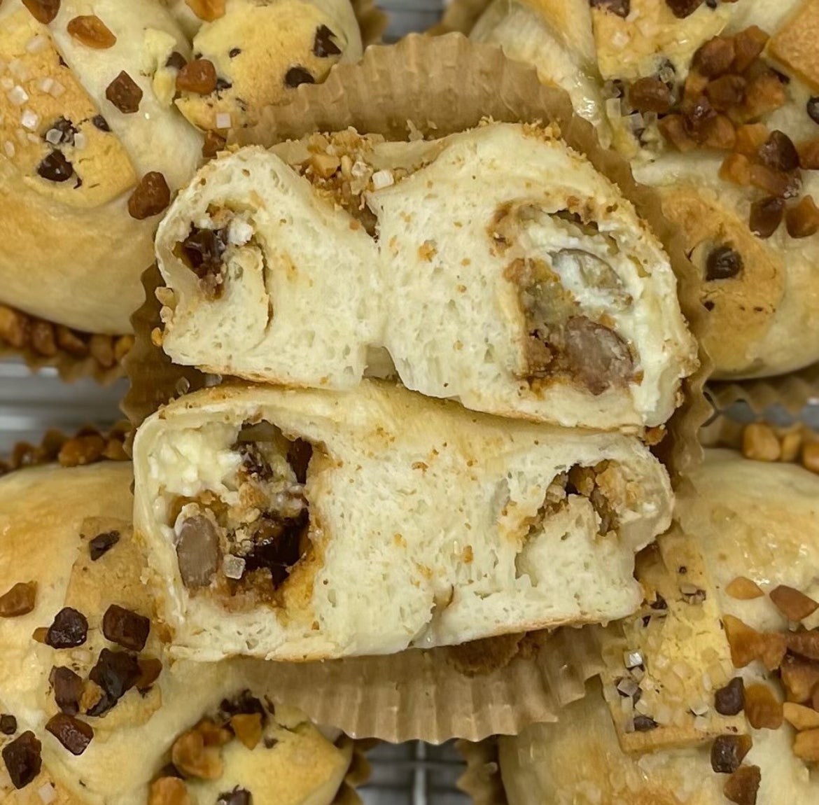 香ばしい香りの黒胡麻生地にじっくりとオーブンで焼いた甘〜い紫芋餡子と香ばしくバター香るさつまいものカラメル塩バターをゴロリと巻き込み