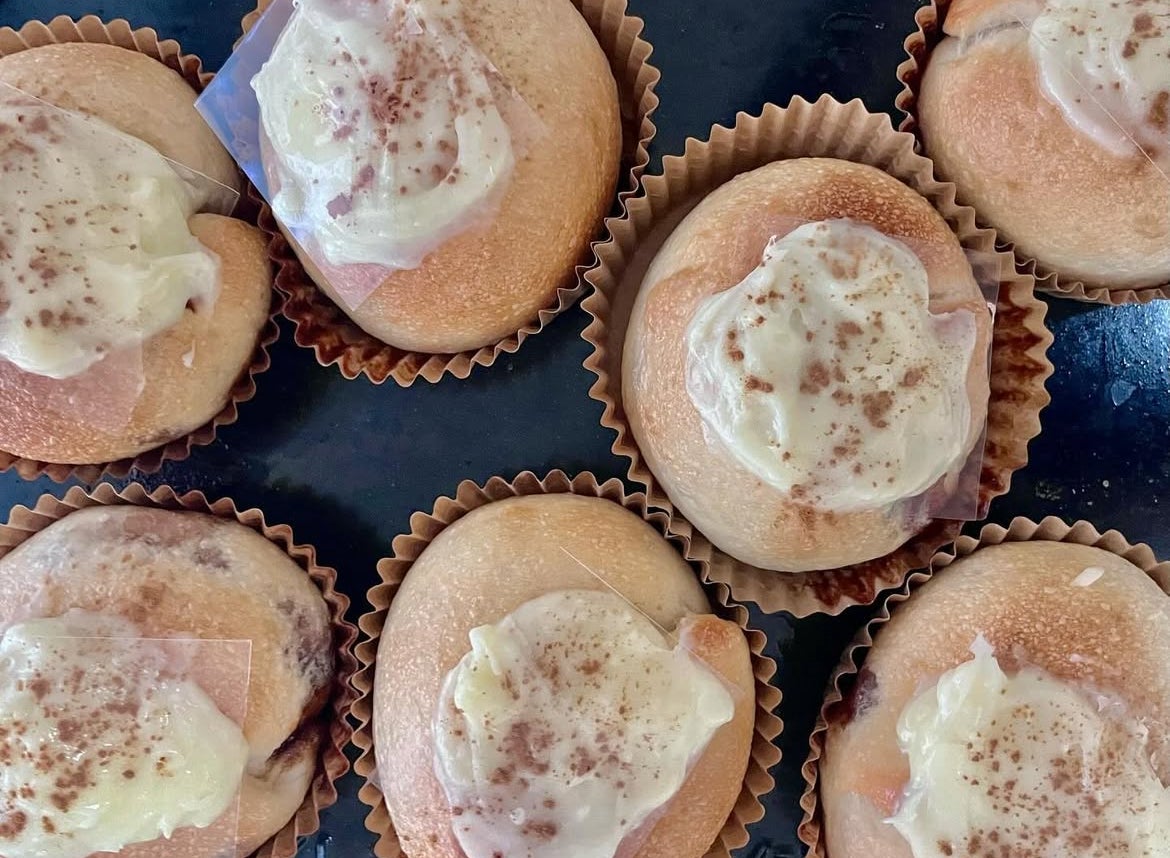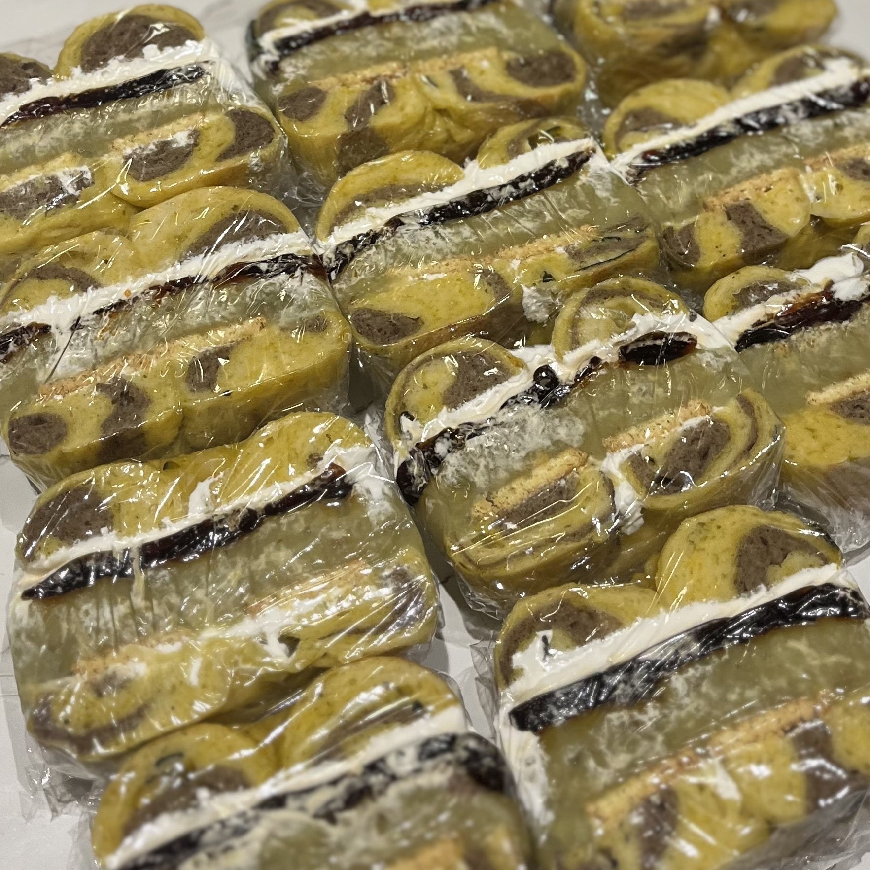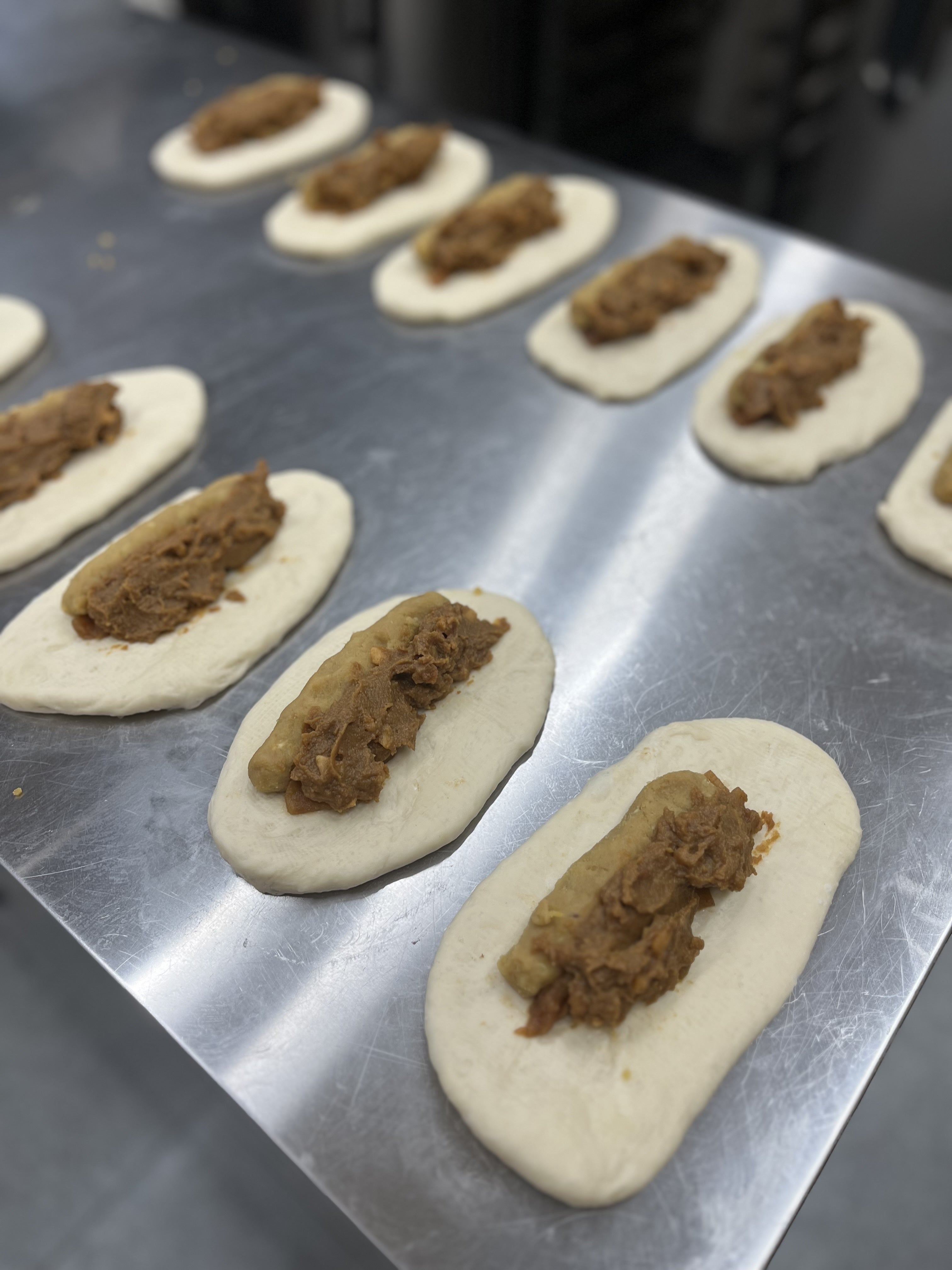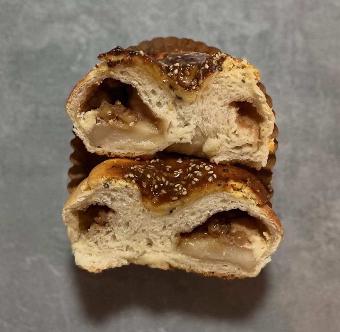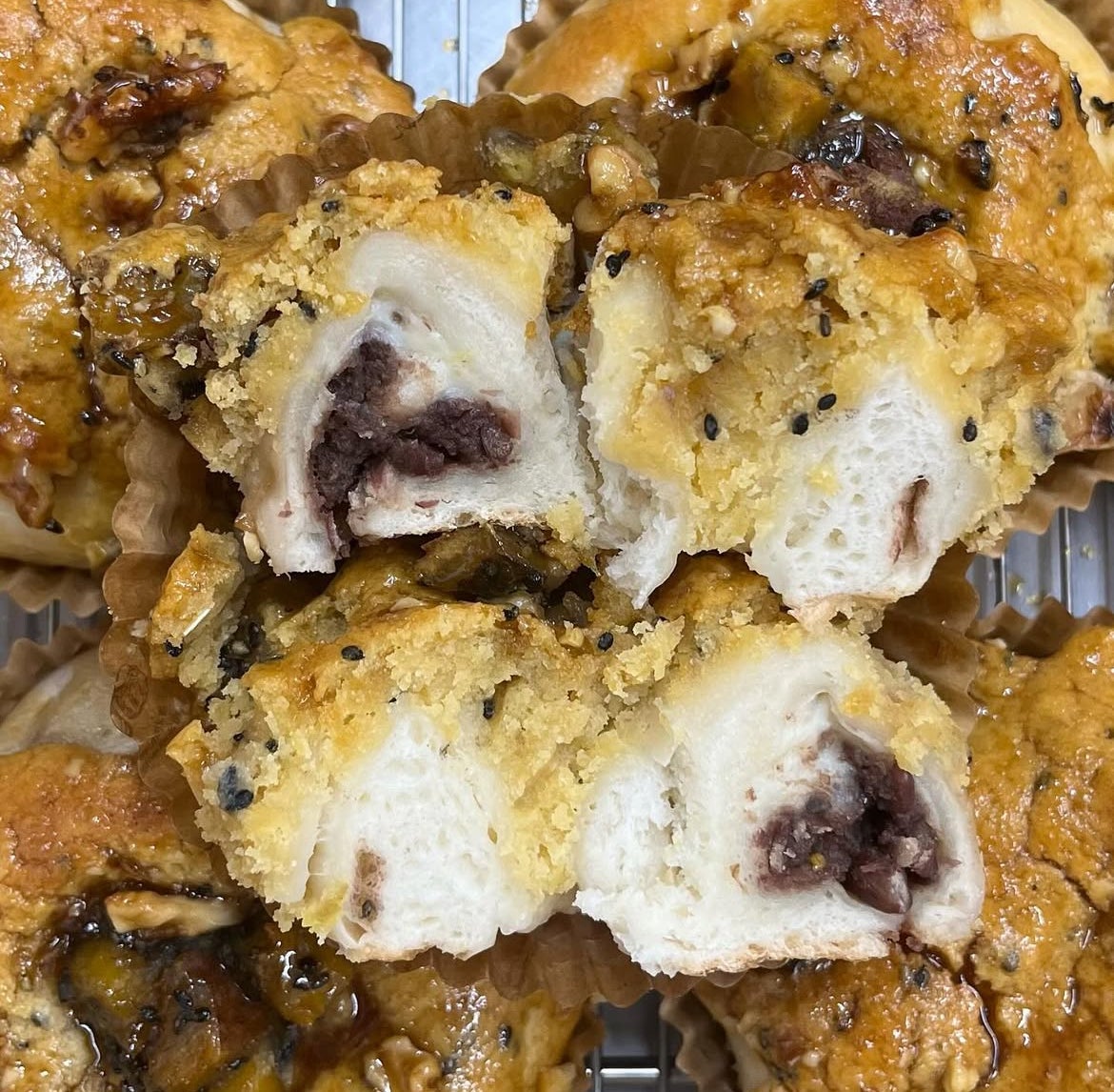 自家製の北海道粒あんに大学芋を混ぜ大学芋粒あんフィリングにアクセントで少しの胡桃と黒胡麻を。クーベルチュールホワイトチョコを使用した甘いミルククリームも巻き込みました。