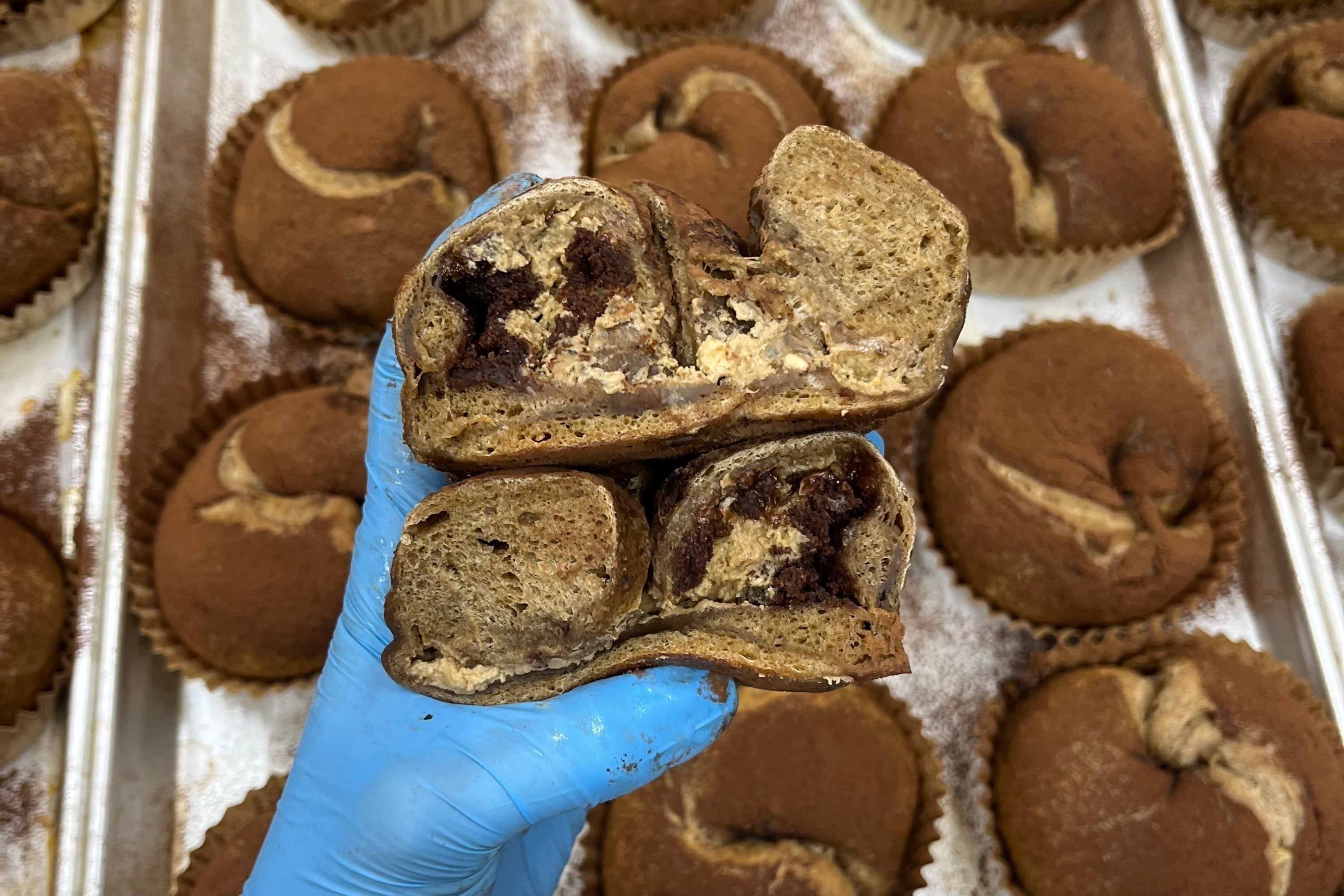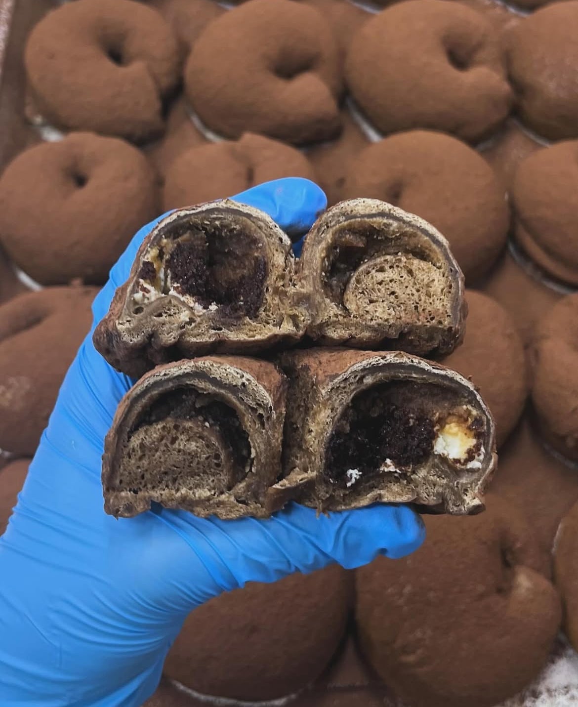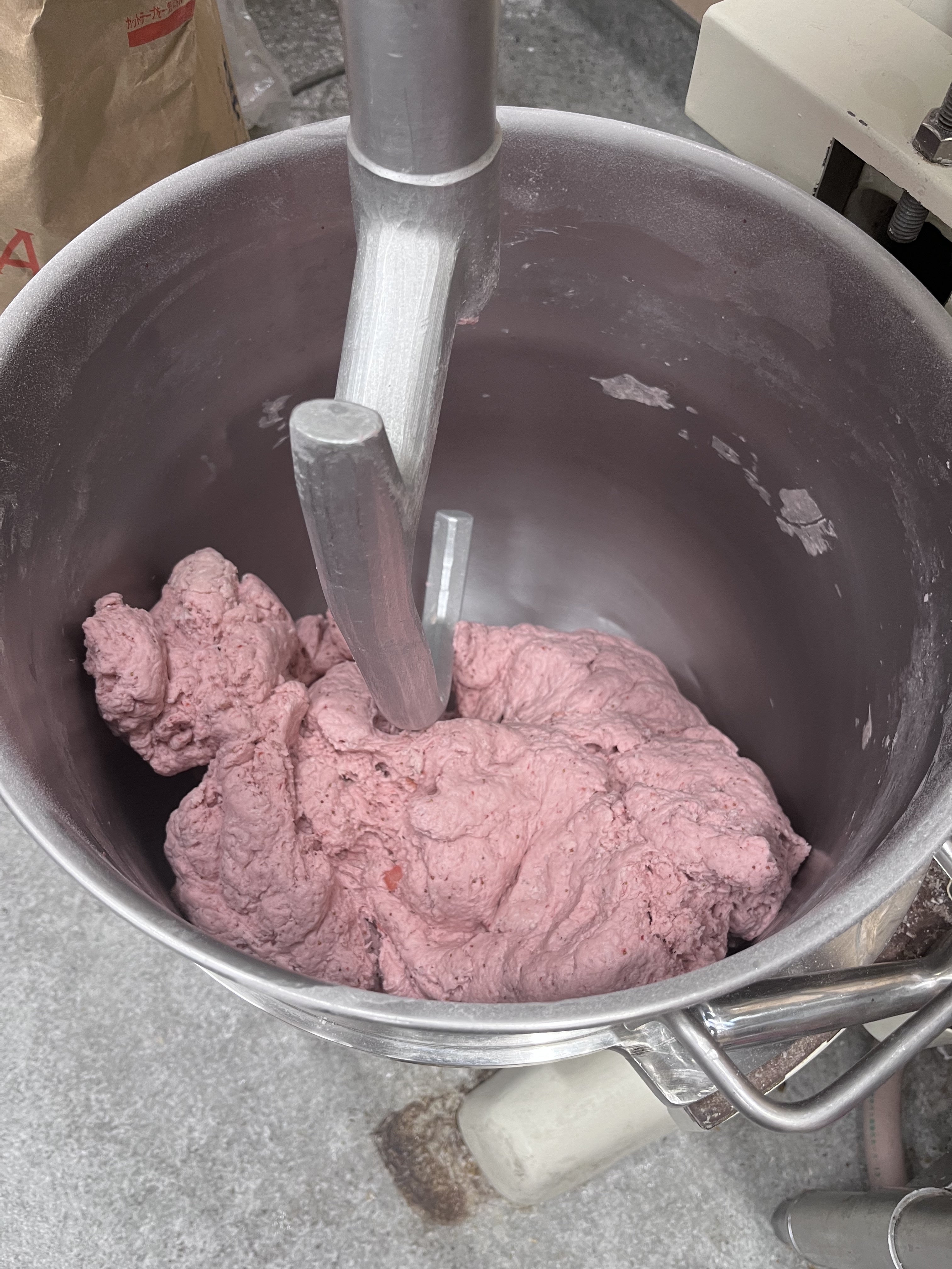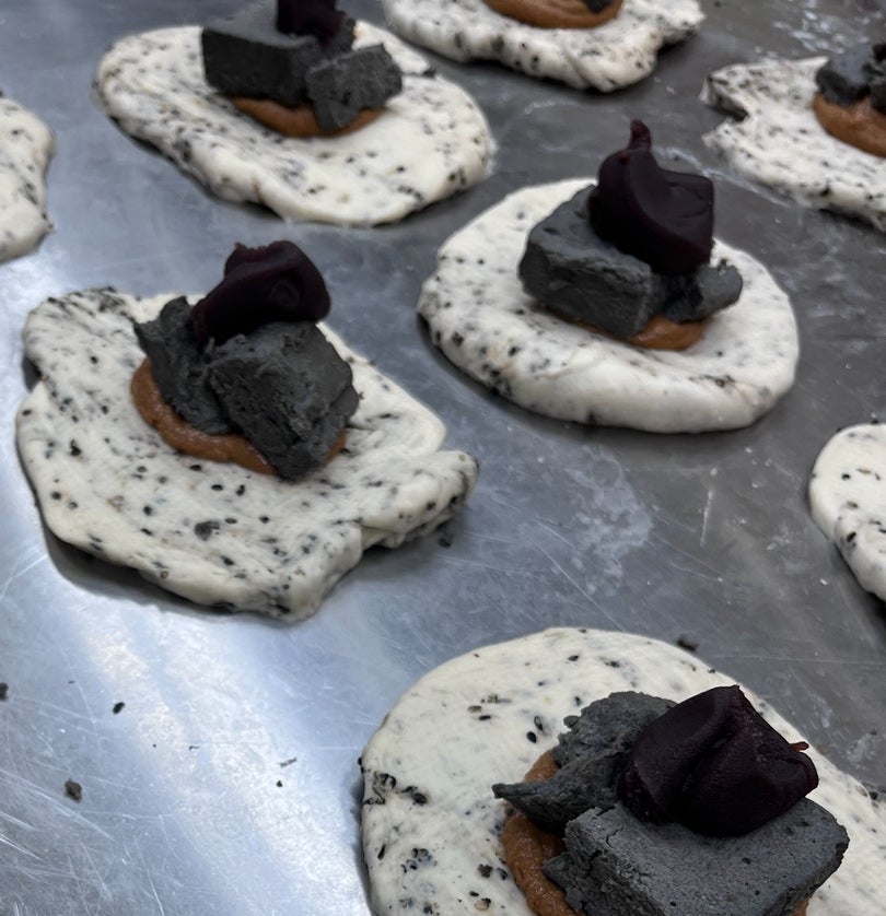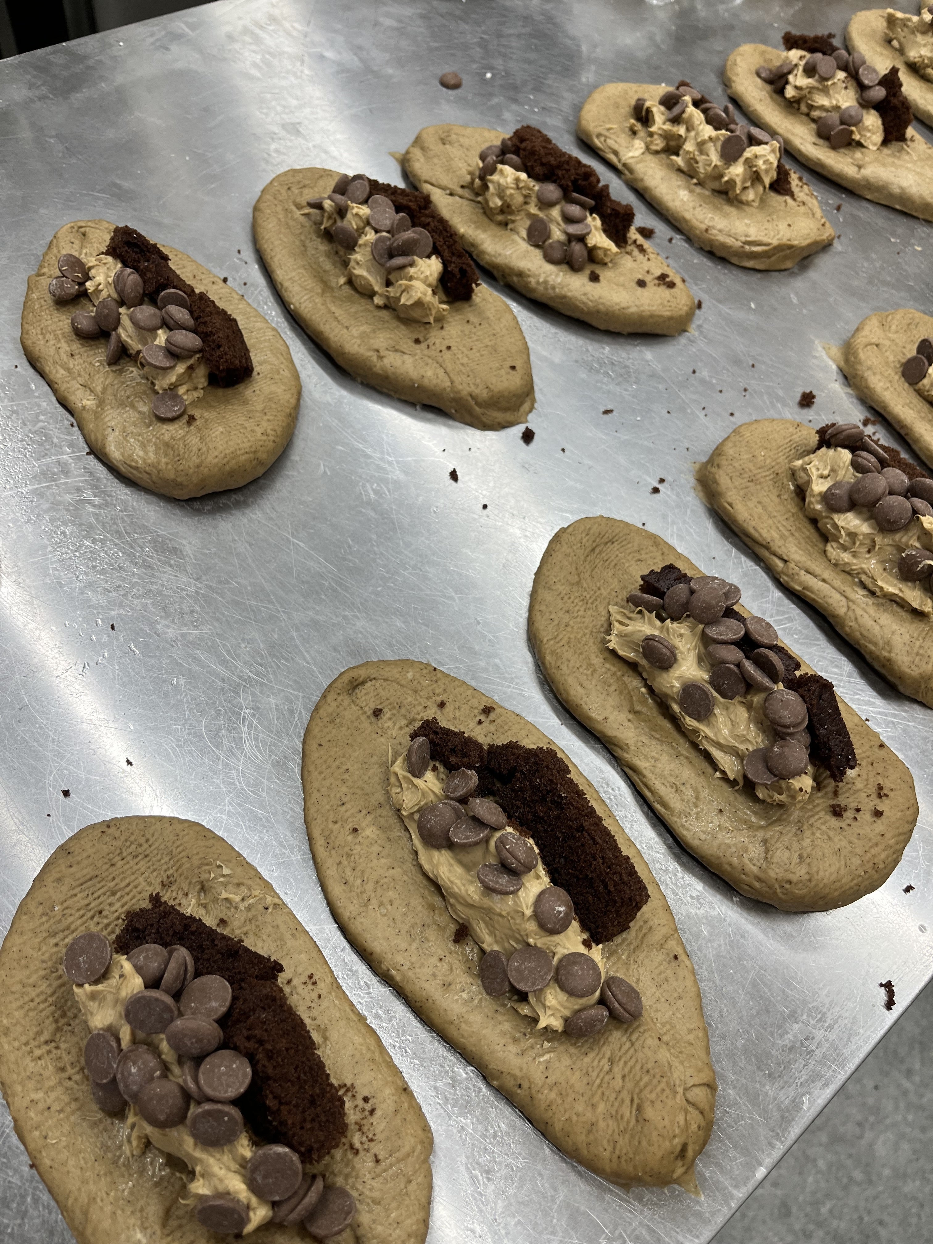 生地には熱に強いグリッツチョコレートを練り込み。こちらのチョコレートカカオマスをたっぷり使用しているもののためとても風味がよく美味しいチョコレート生地に仕上がりました。生地はお餅のような弾力でもちもちです。