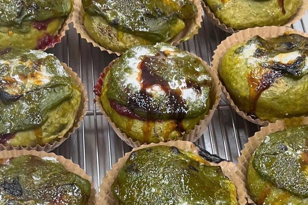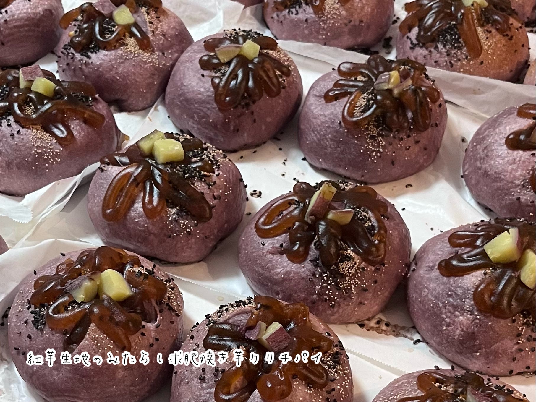 もっちり紅芋生地にクリームチーズと紅はるかのさつまいも餡子と源氏パイと自家製白玉と自家製みたらしを包み込み。