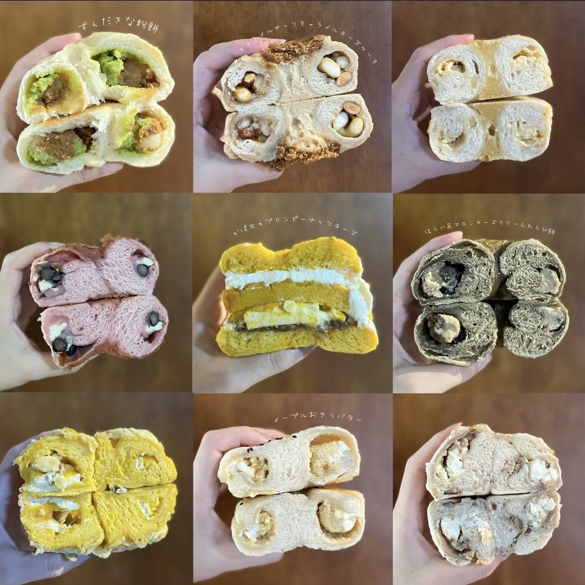 この一つの中にベーグルの中に黒胡麻ピーナッツ八橋風餡子も求肥もピーナッツチーズケーキもピーナッツクランブル全て詰まってます。全て自家製です。