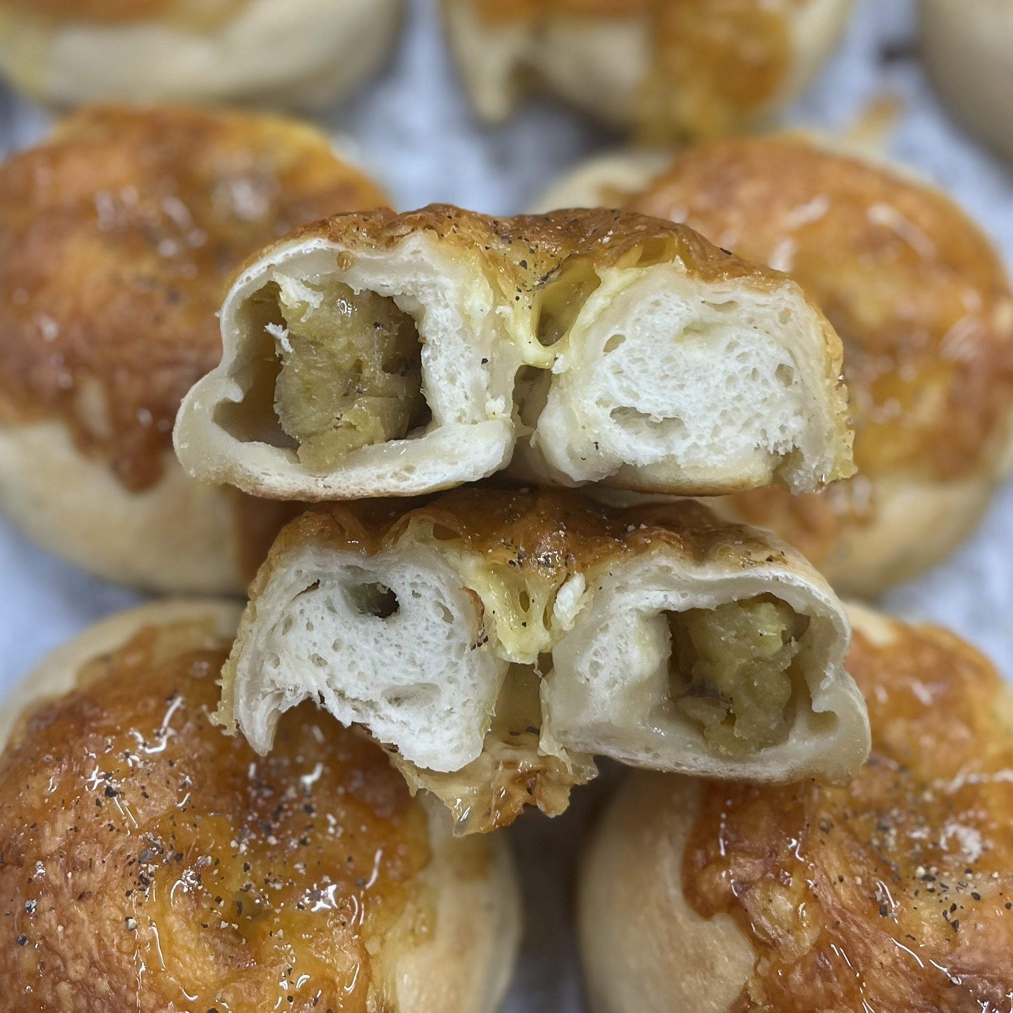 2時間かけて焼いた甘いねっとり焼き芋とハニーバターを巻き込み。チーズとブラックペッパーをかけて焼き上げ。蜂蜜をかけて仕上げ