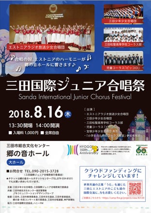 兵庫県三田(さんだ)市は、兵庫県の南東部に位置し、神戸市の市街地より六甲山系を越えた風光明媚な場所。 豊かな環境と穏やかな気候に恵まれたこの地に育つ子ども達が、8,000キロ離れたエストニアの子供達に会いたい!一緒に歌をうたいたい!と夢を燃やして取り組んでいます。私達「 三田国際ジュニア合唱祭実行委員会」は、そんな子ども達を応援したいと、三田市を拠点に活動する三田少年少女合唱団が母体となって2014年に立ち上がりました。実行委員のほとんどが、三田市内・近郊で合唱団に所属する子ども達の「お母さん」。 子ども達がうたを通じた国際交流を体験して大きく成長する事を、母の気持ちで応援したいと願っています。このプロジェクトでは合唱大国エストニアからやってくる子ども達との交流の実現を目指します。子ども達の宝になる経験を、 是非とも応援お願いします!
