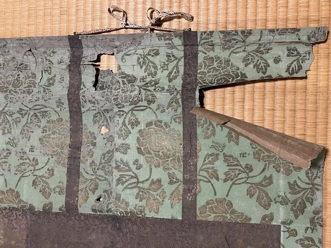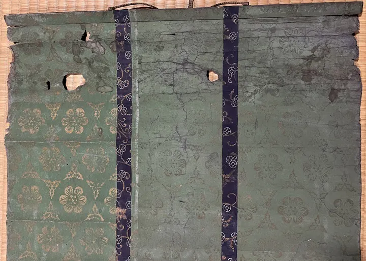 現在は軸の上部が朽ち、掛ける事ができない状態となっています。保存する際も破れが広がらないように気を付けています。