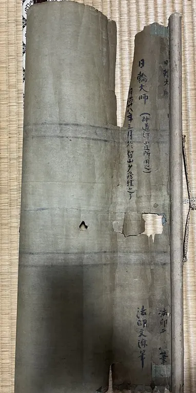 軸書に神道灌頂小旦所に之を用いるとあり、明治38年3月に智山(智積院)にて修復された事がわかっています。しかし、破れている箇所が広がってしまうと墨書まで損なってしまいかねません。